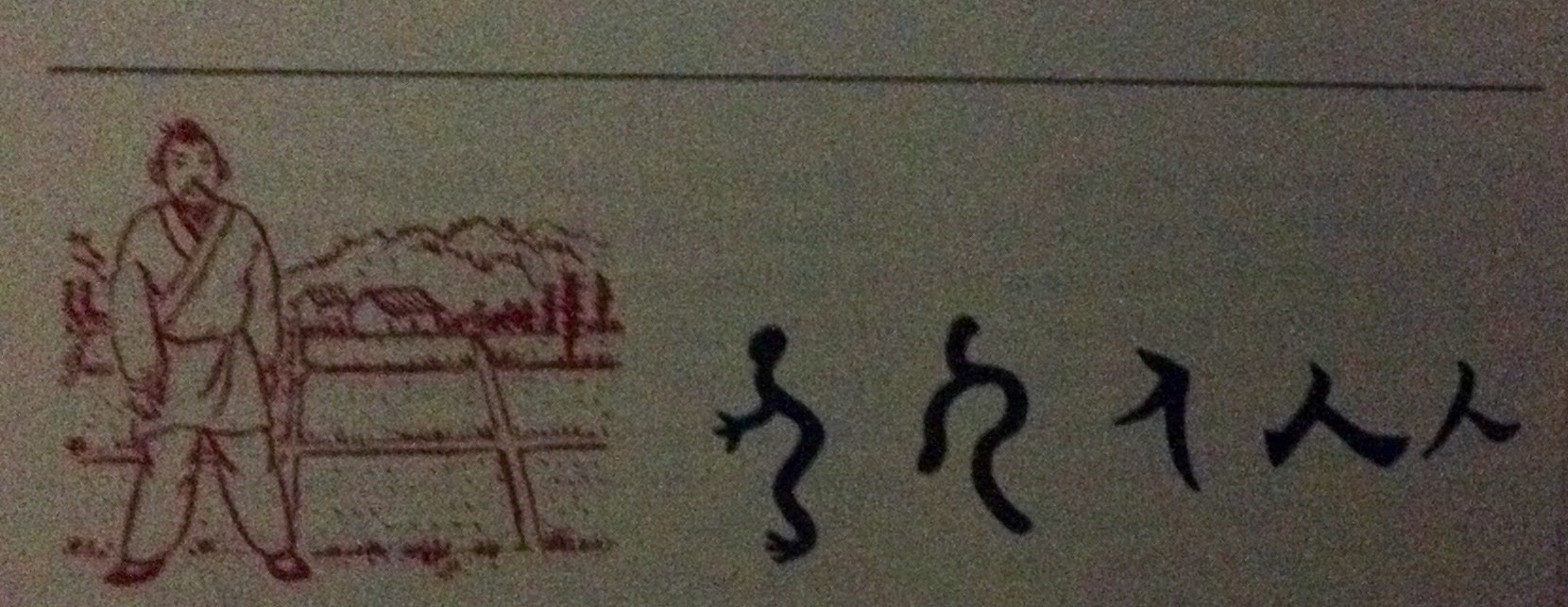Das Schriftzeichen >Mensch< in seiner ursprünglichen piktographischen wie auch in seiner gegenwärtigen Form hebt das besondere Merkmal des Menschen hervor: seinen aufrechten Gang. Zuerst sehen wir einen Menschen im Profil mit deutlich erkennbarem Kopf, mit Händen und Füßen. Das heutige Zeichen reduziert ihn auf seine Vorderansicht, mit gespreizten Beinen. Diese Haltung drückt Macht, Autorität und Selbstsicherheit aus.