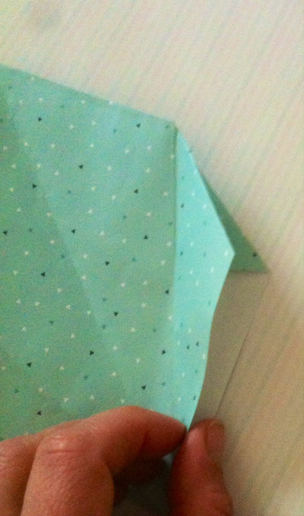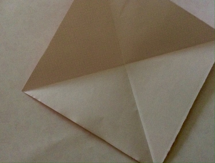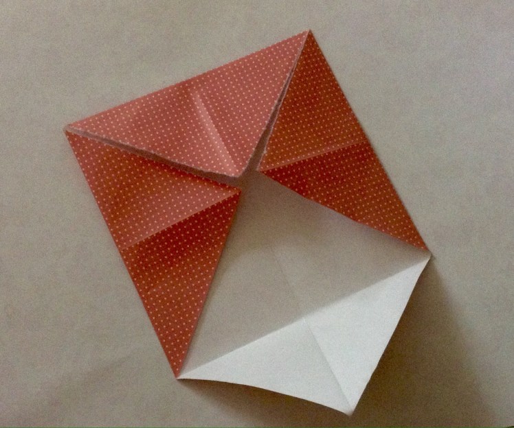 Schritt drei: Die unteren Seiten der oberen Lage an die Mittellinie falten, so dass die Form einer Tüte entsteht. Das Papier wenden und den Vorgang auf der anderen Seite wiederholen. Mit dem Finger in die Öffnung des zur Mitte gefalteten Stückes fahren und das Papier beim Falz dann runterdrücken, so dass es wie auf dem Foto aussieht. Dies an den anderen drei gleichen Stellen wiederholen.