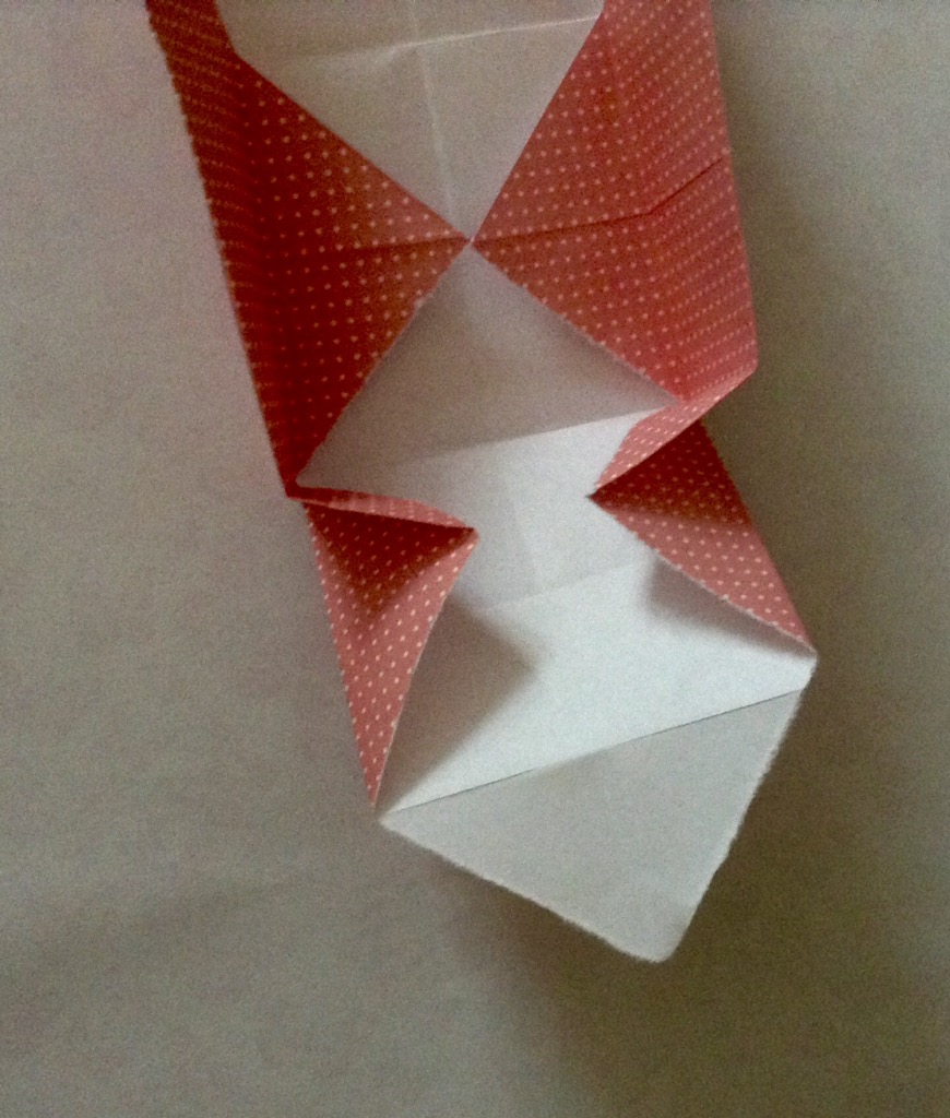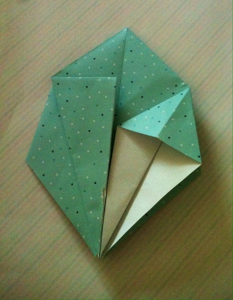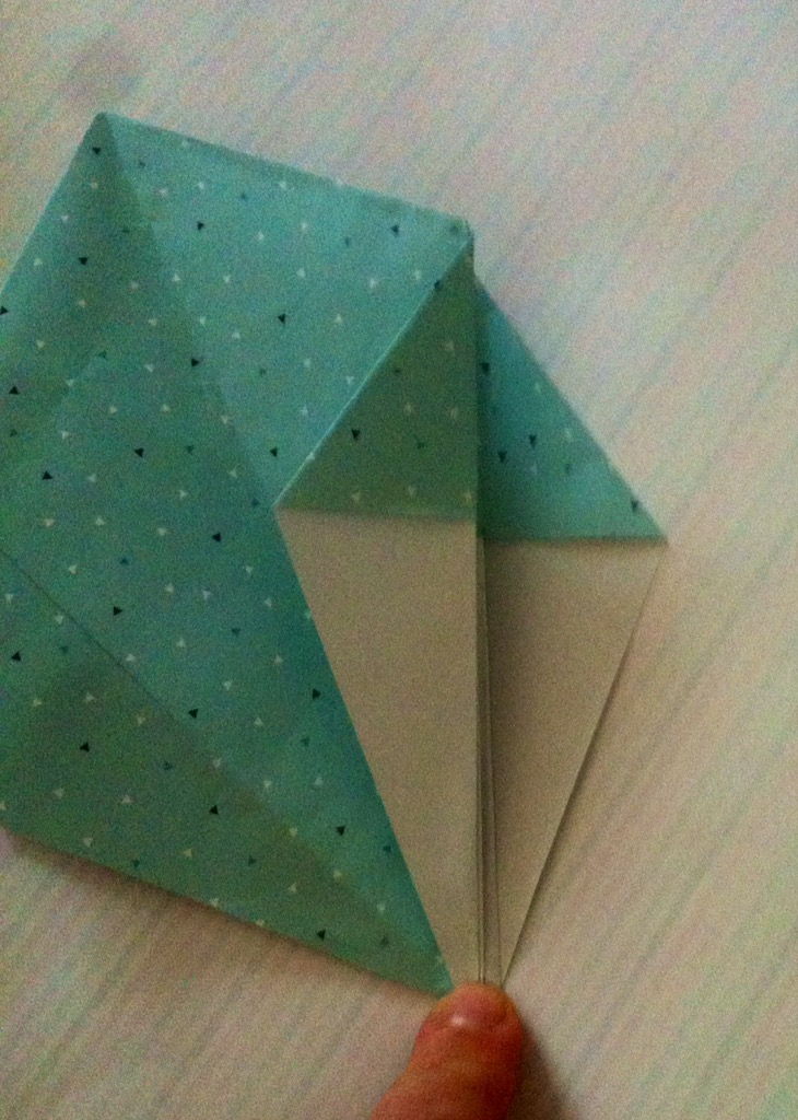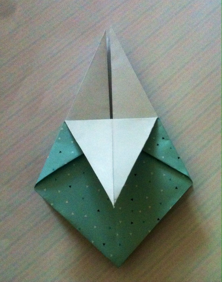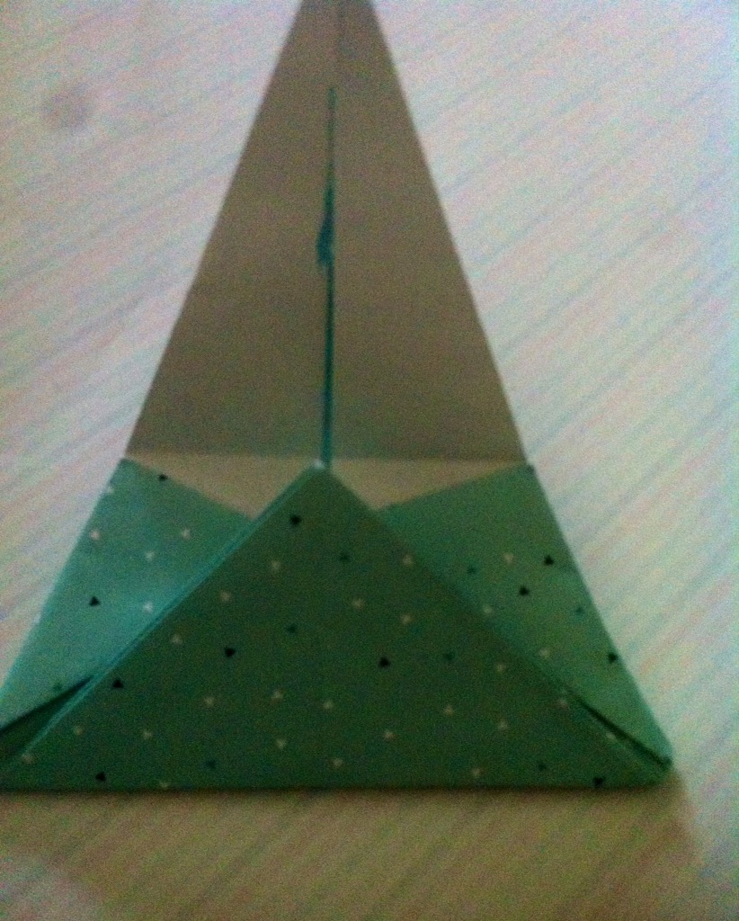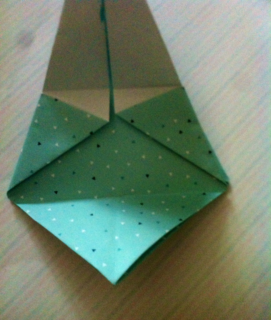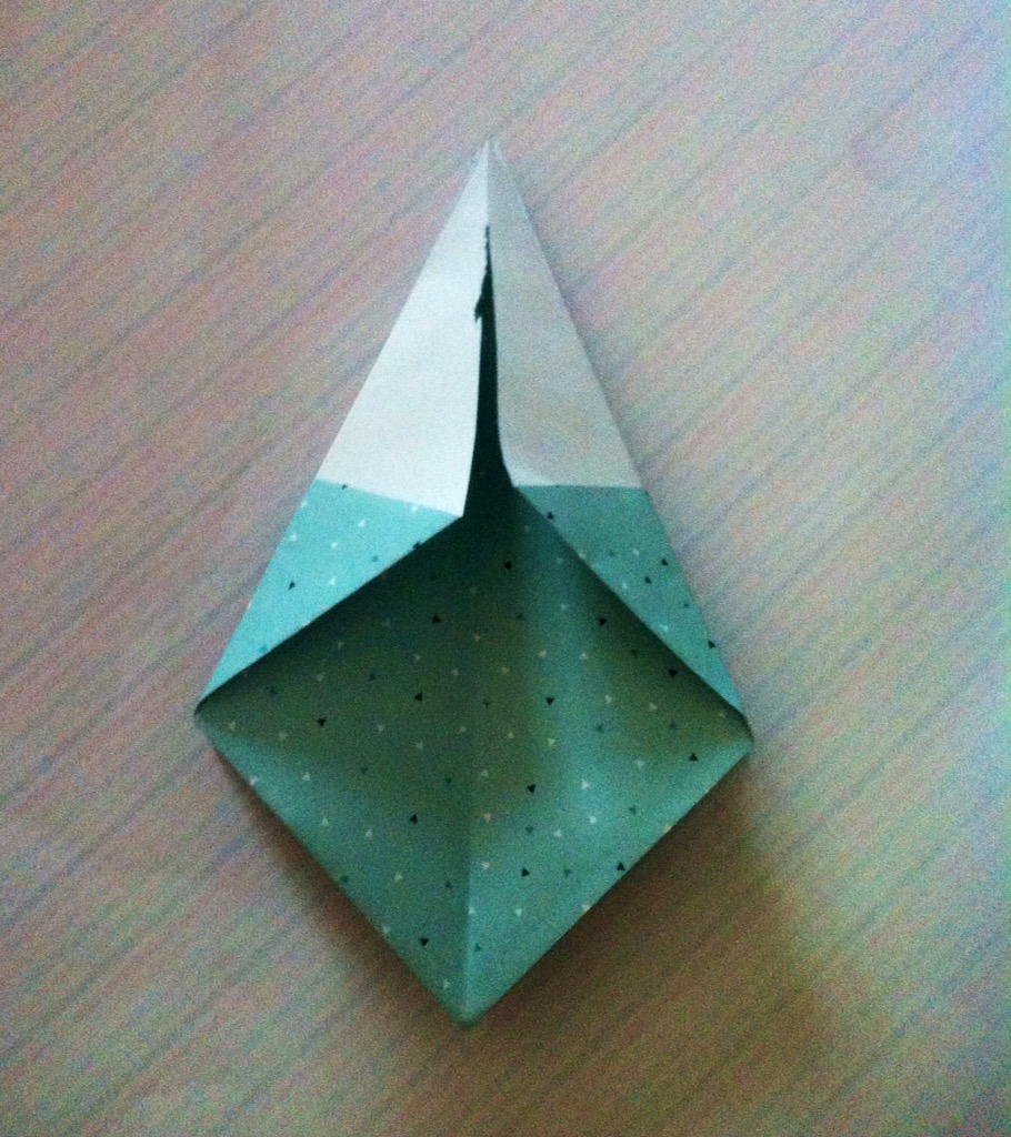 Schritt sieben: Das Werk vor euch legen und die untere dicke Spitze nach oben Falten und wieder öffnen.