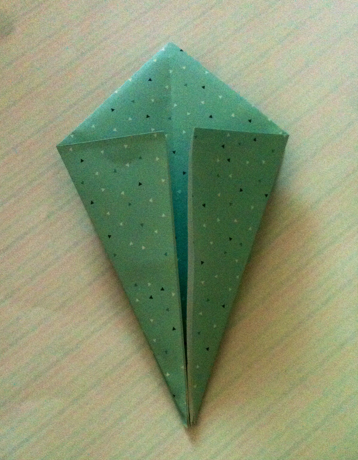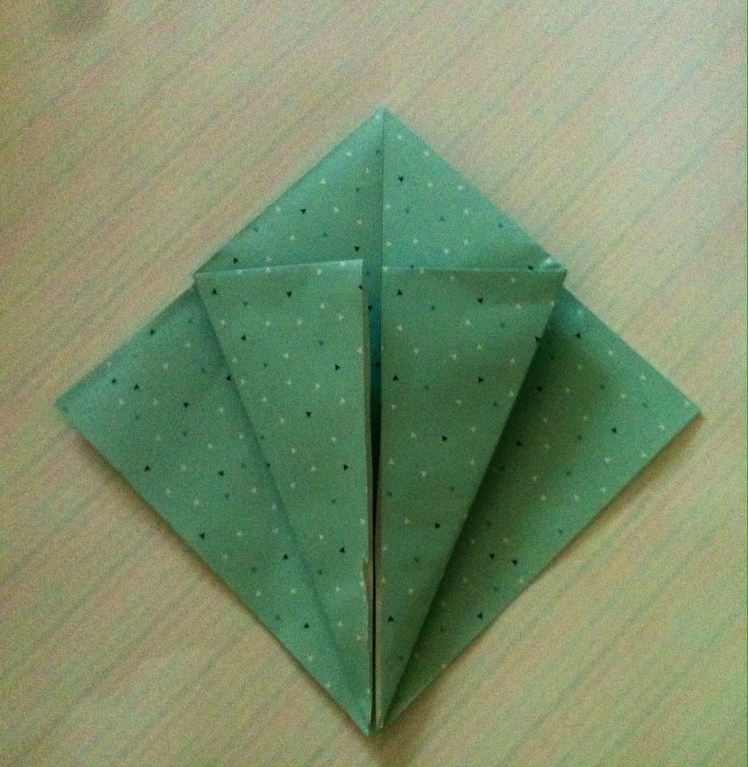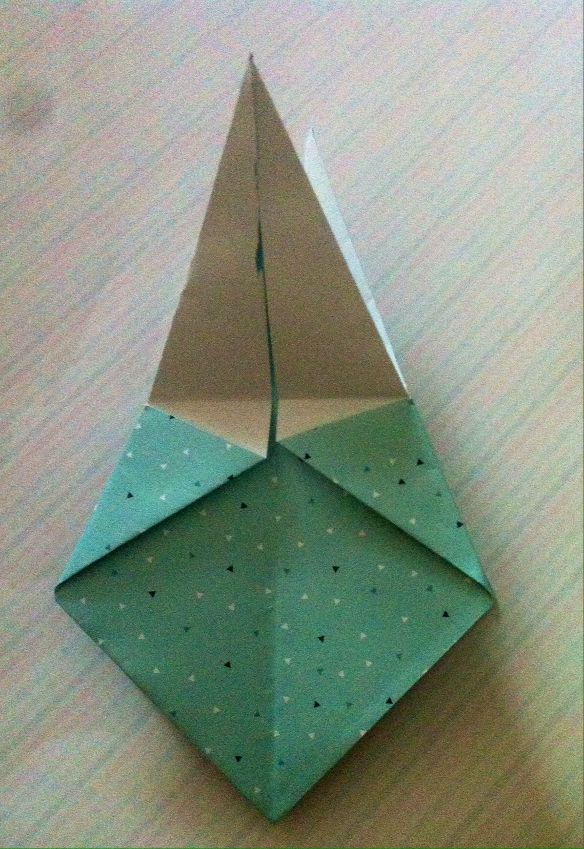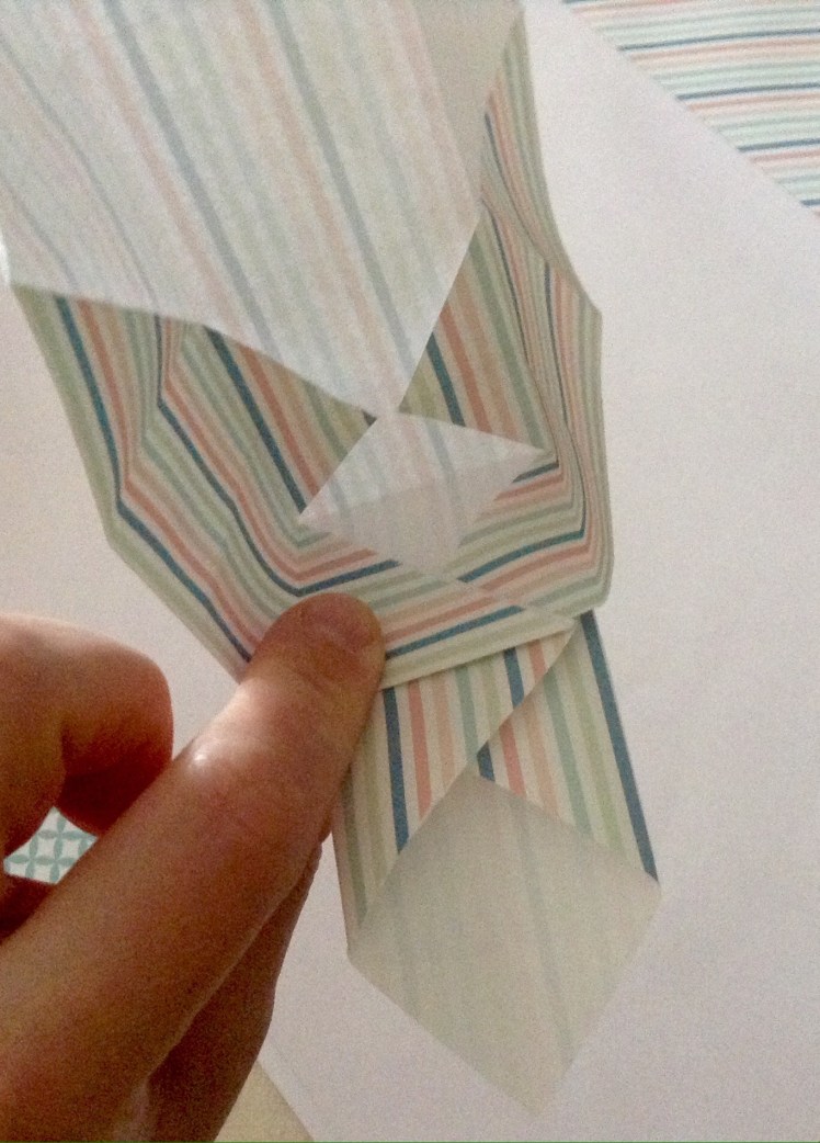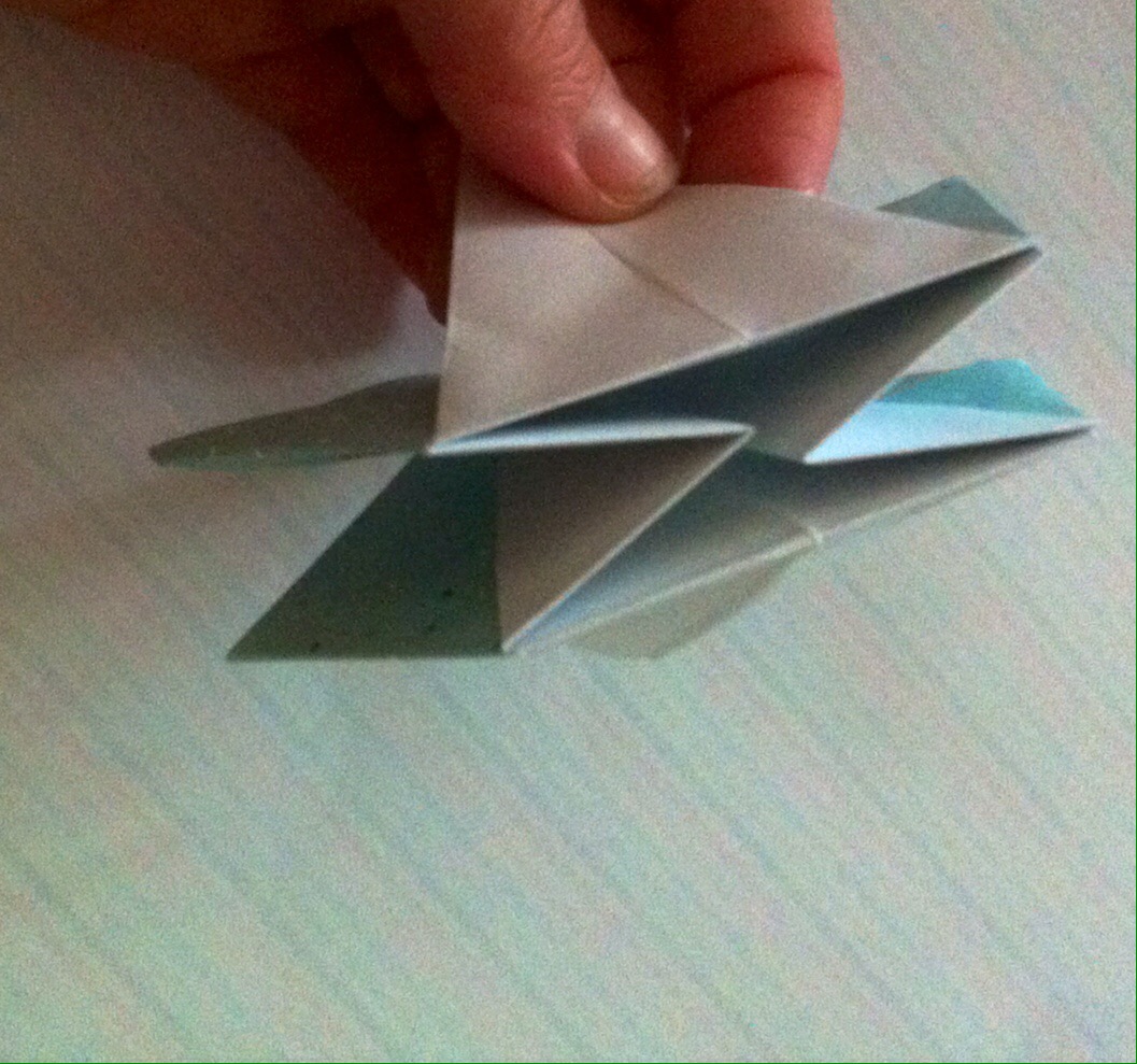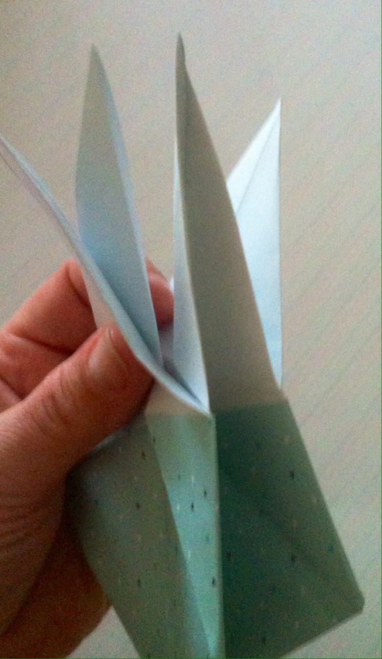 Schritt sieben: Das Werk vor euch legen und die untere dicke Spitze nach oben Falten und wieder öffnen.