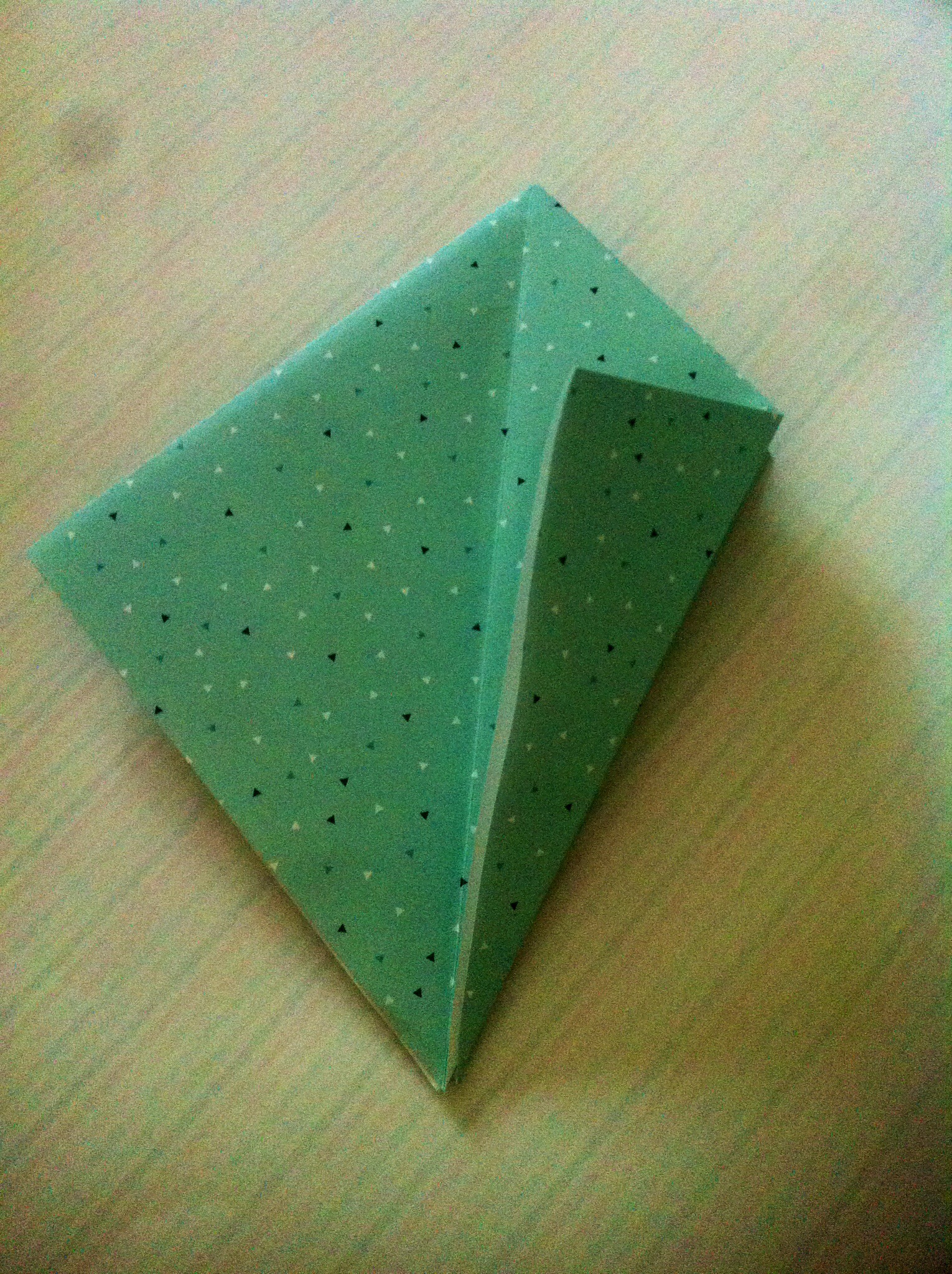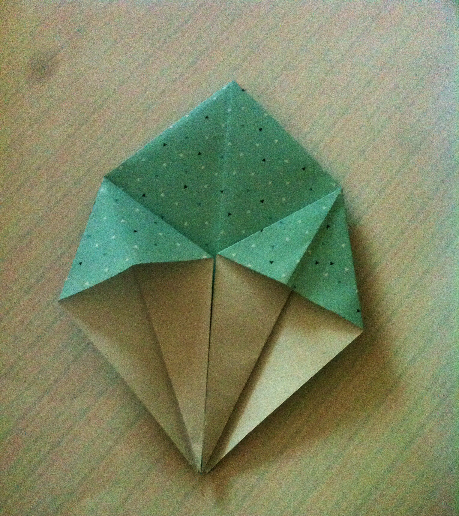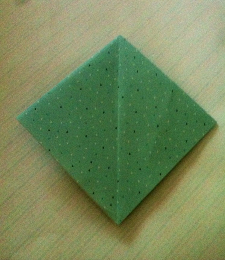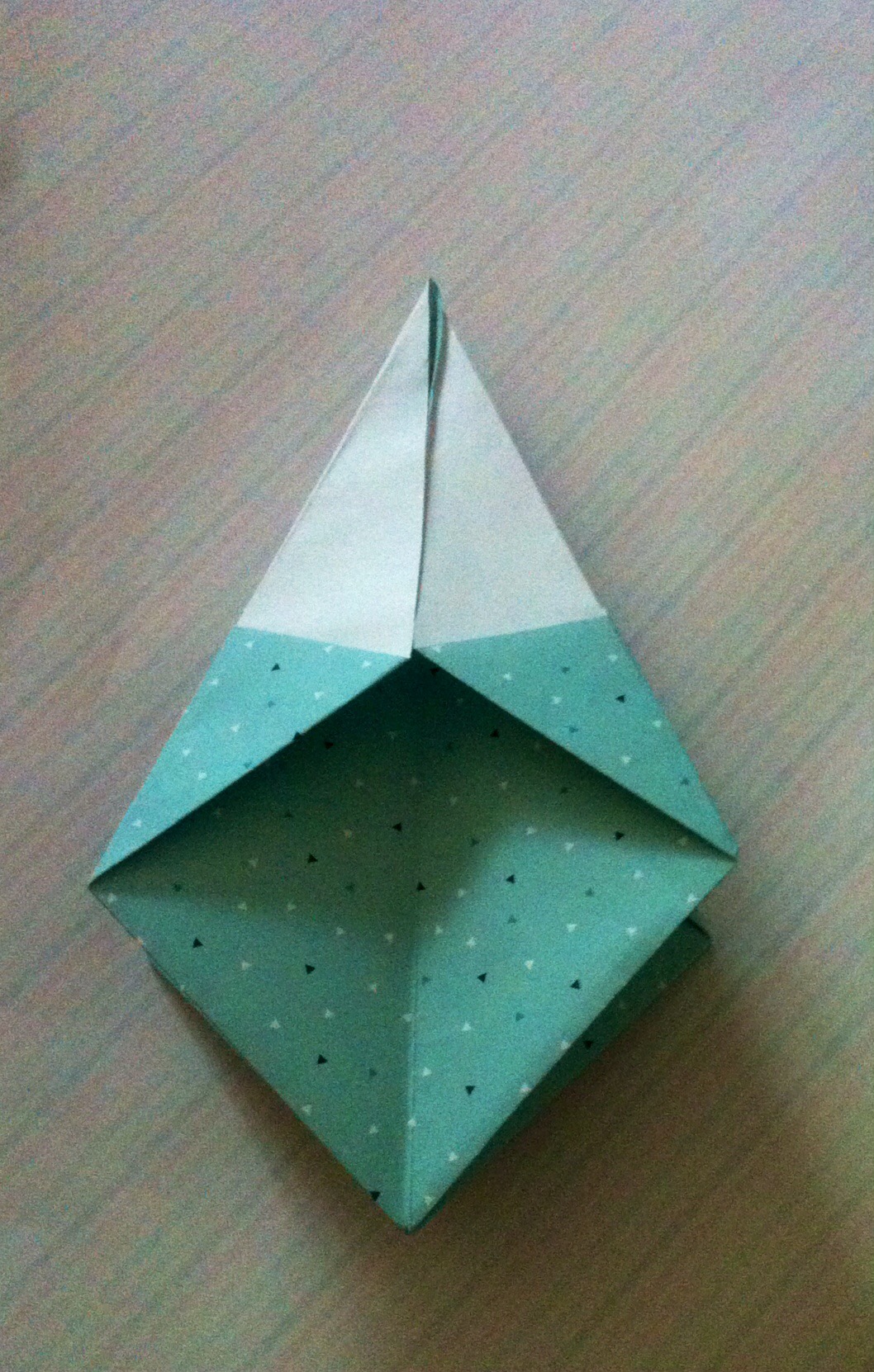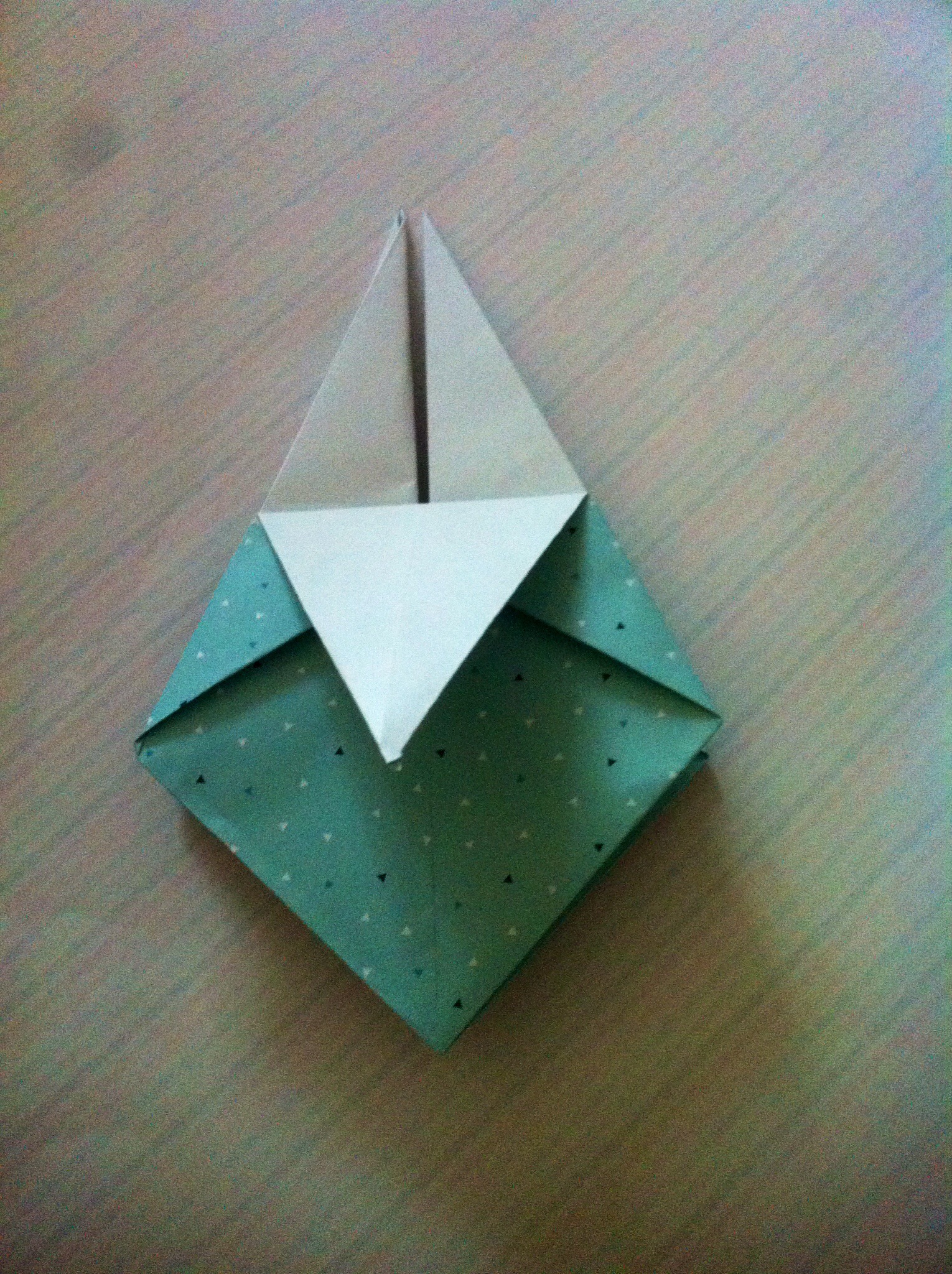Schritt sieben: Das Werk vor euch legen und die untere dicke Spitze nach oben Falten und wieder öffnen.