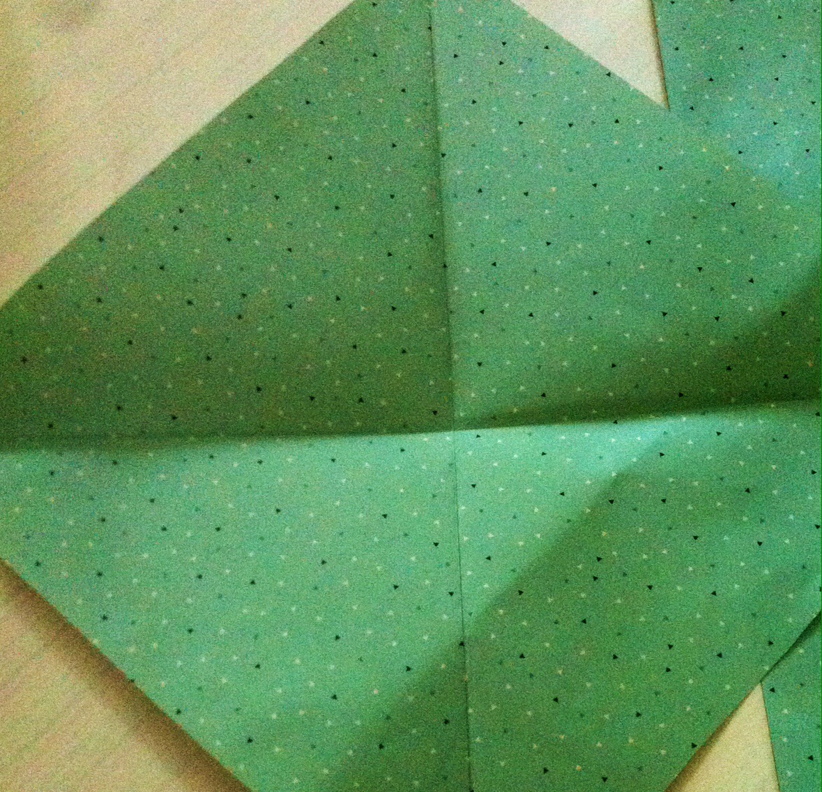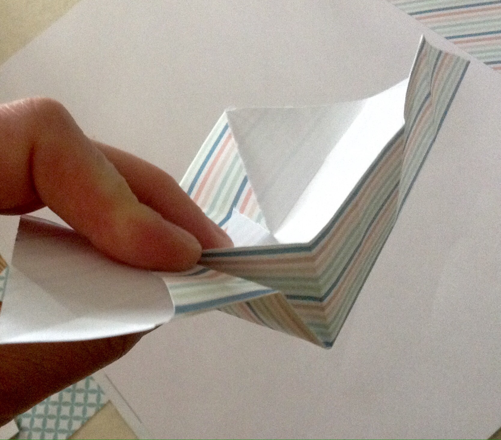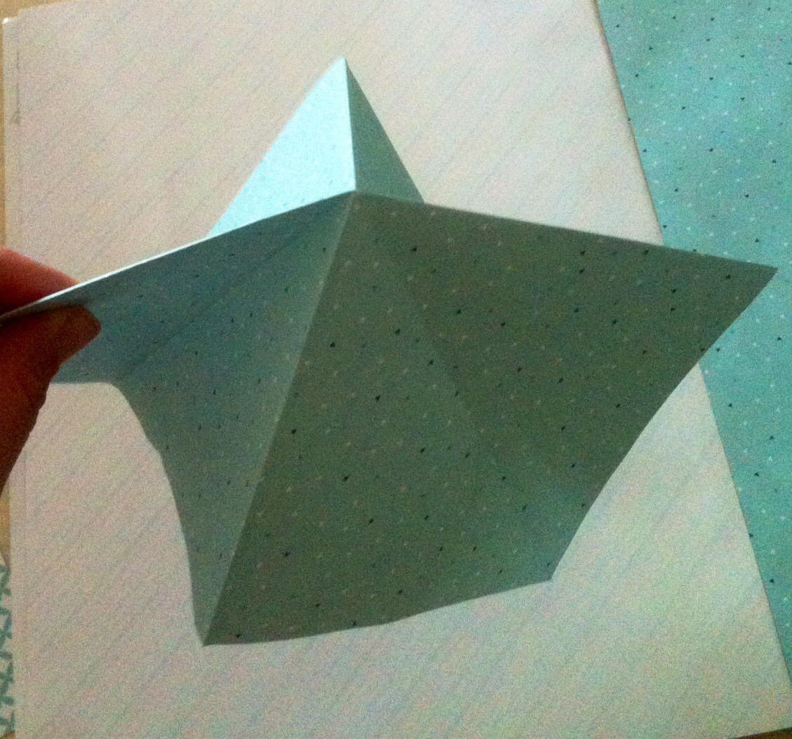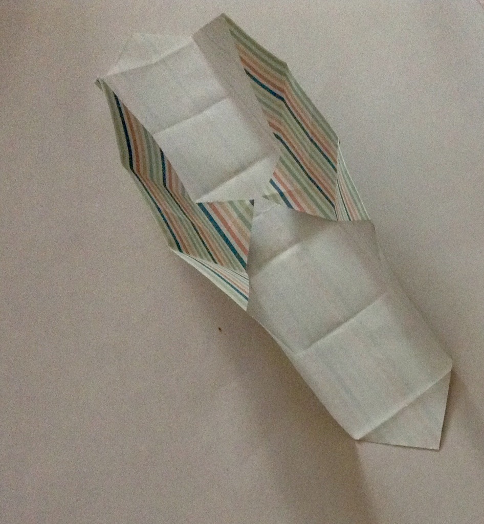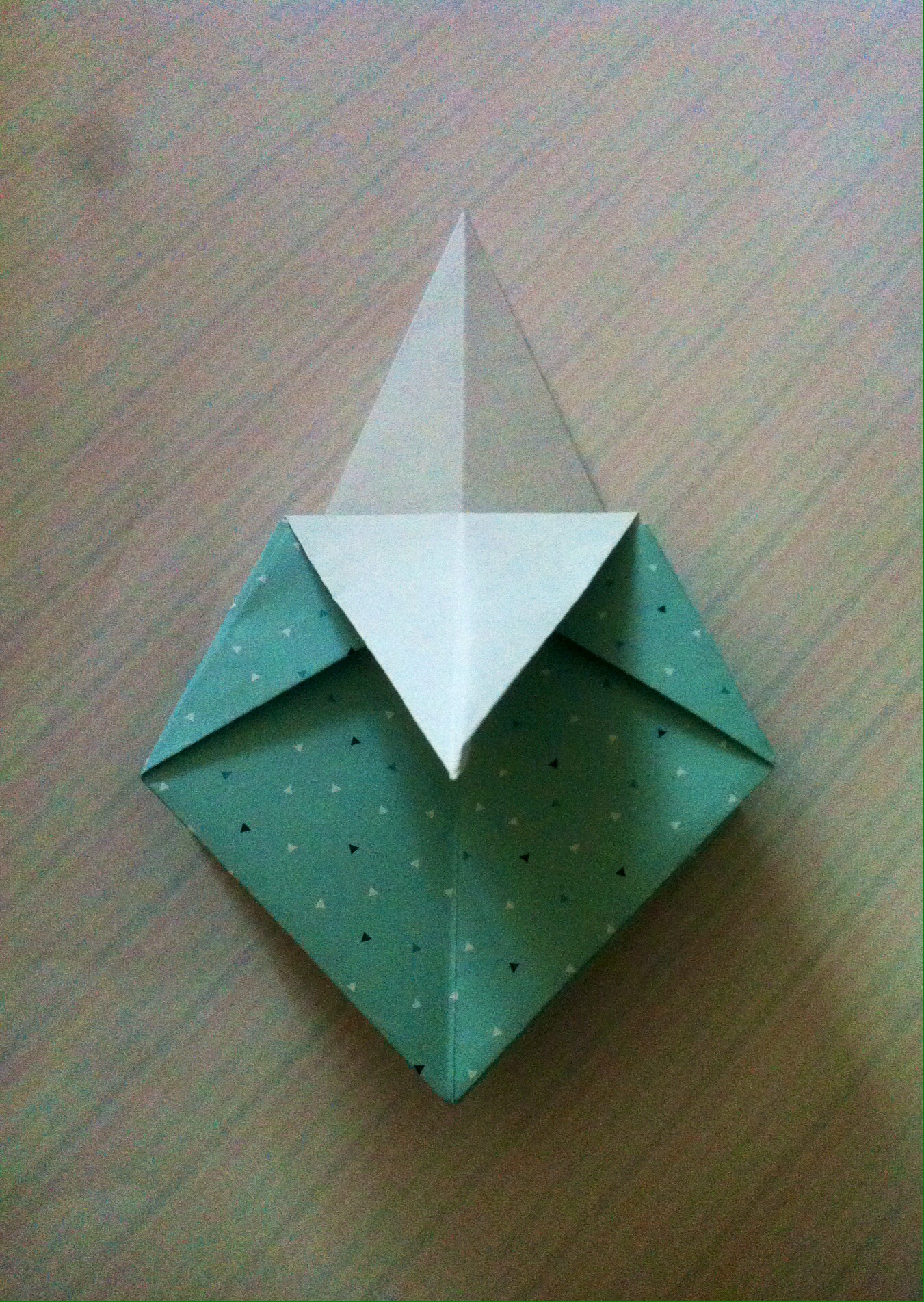 Schritt sieben: Das Werk vor euch legen und die untere dicke Spitze nach oben Falten und wieder öffnen.