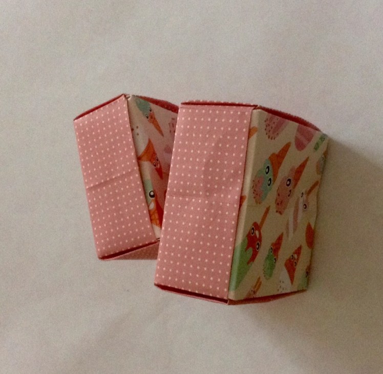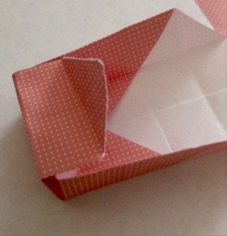 Schritt fünf: Die beiden außen liegenden Ecken nach oben klappen und dabei das Papier wie auf dem Bild gezeigt nach innen klappen. Die Ecken über die so entstandene Wände falten und festdrücken. Der erste Teil der Schachtel ist fertig.