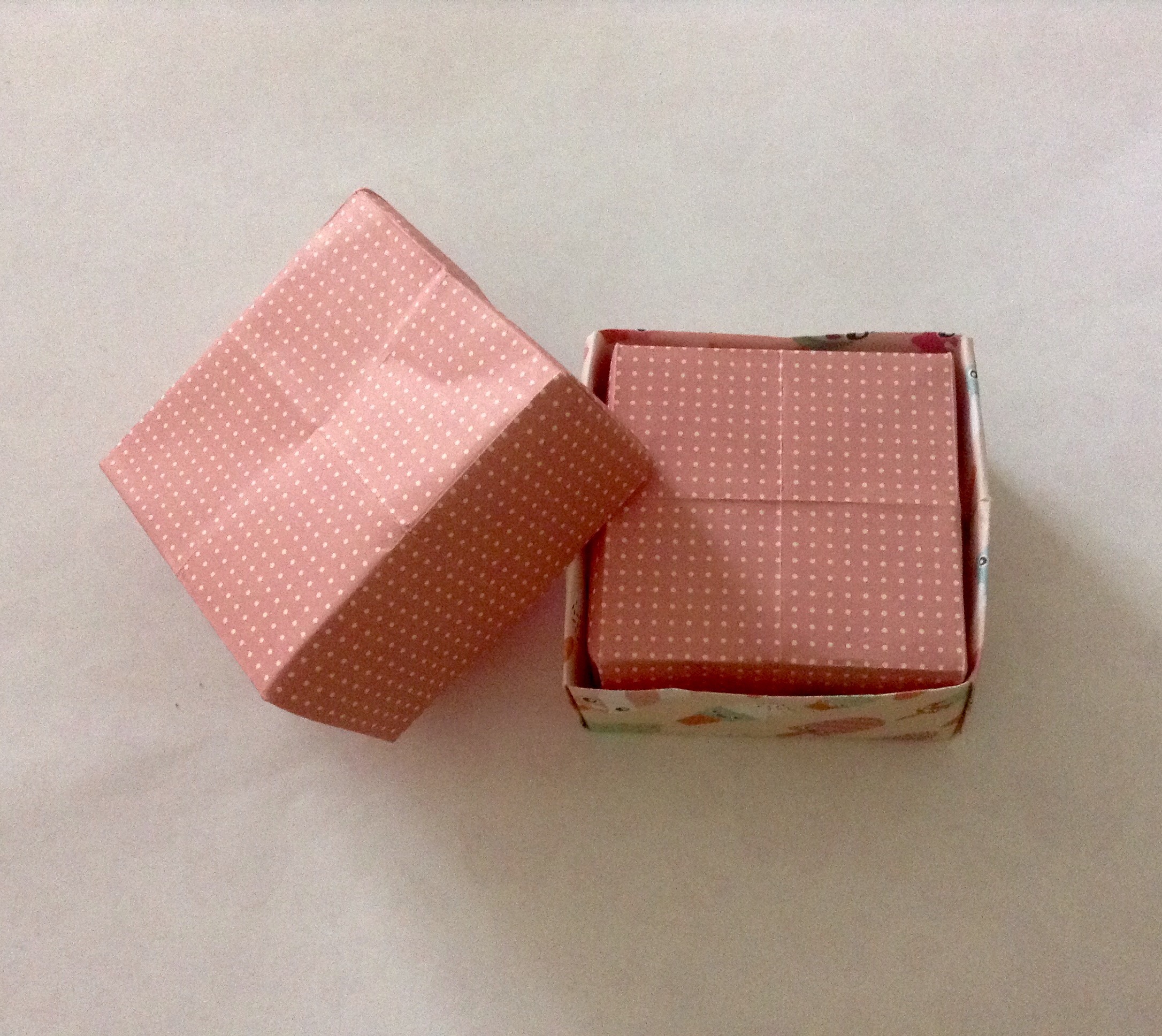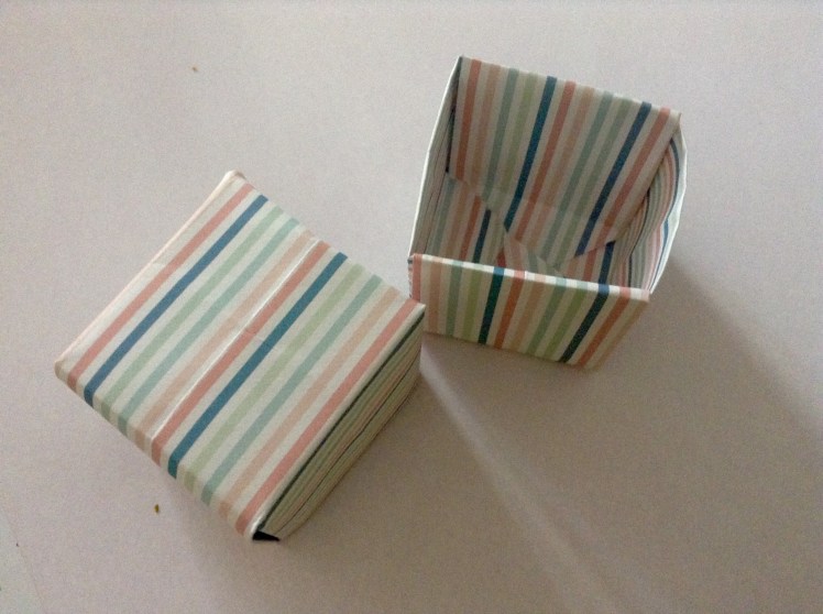 Variation: Wenn ihr nun ein ca. 2cm kleineres Papier in Quadratform nehmt und daraus eine Schachtel bastelt, könnt ihr diese in die erste Schachtel stecken und so weiter. So habt ihr eine Matroschka-Schachtel.
