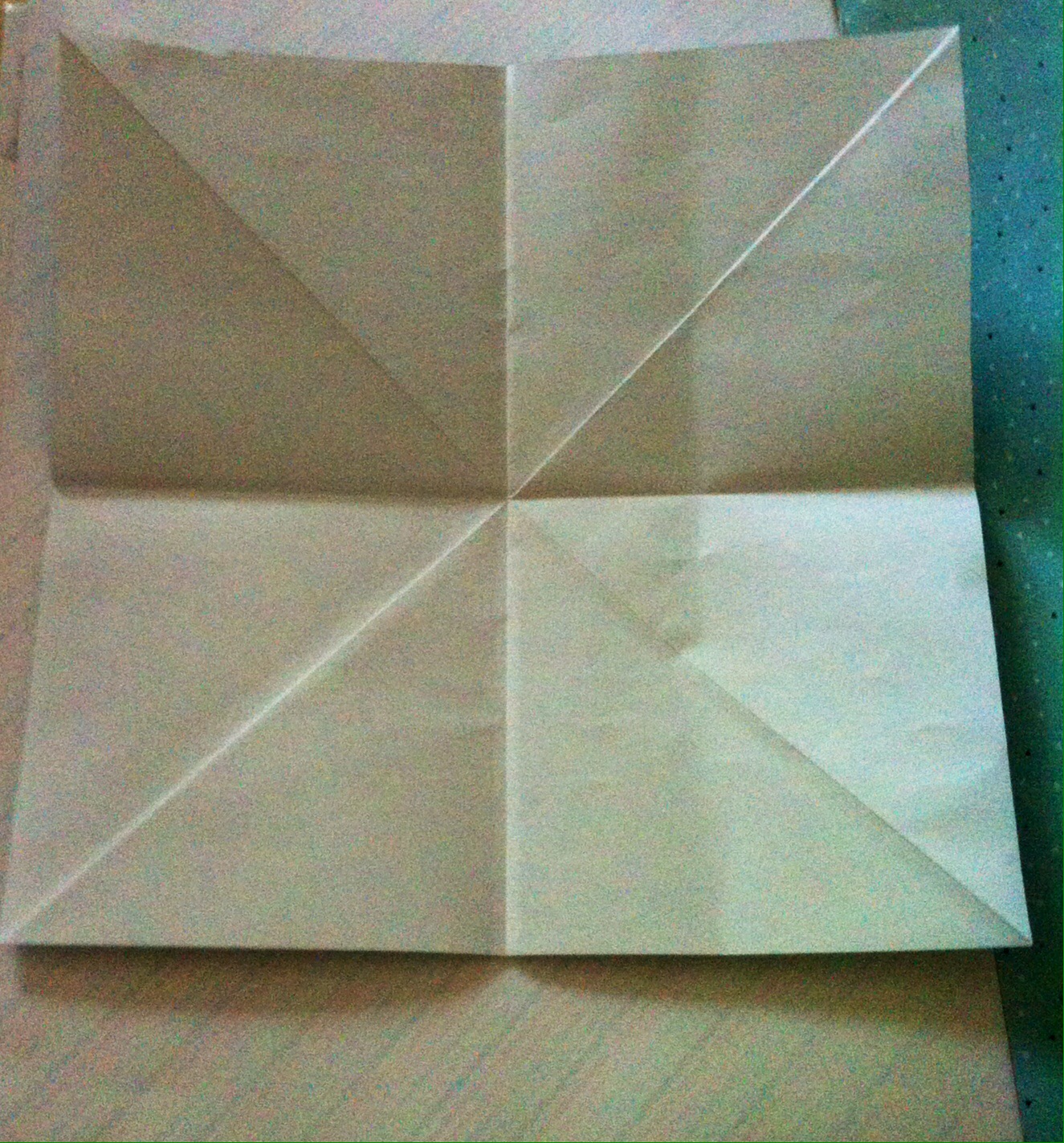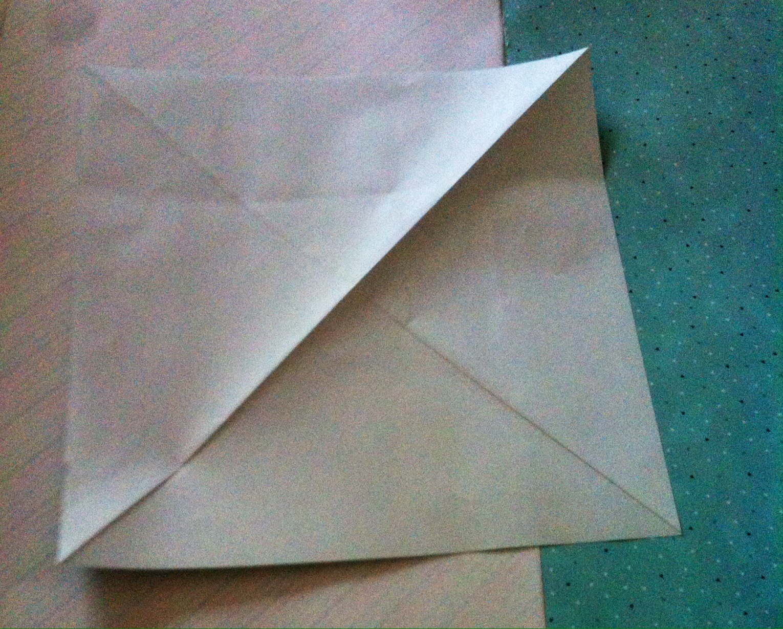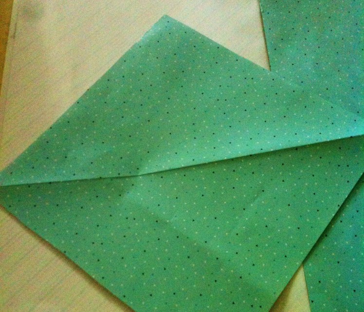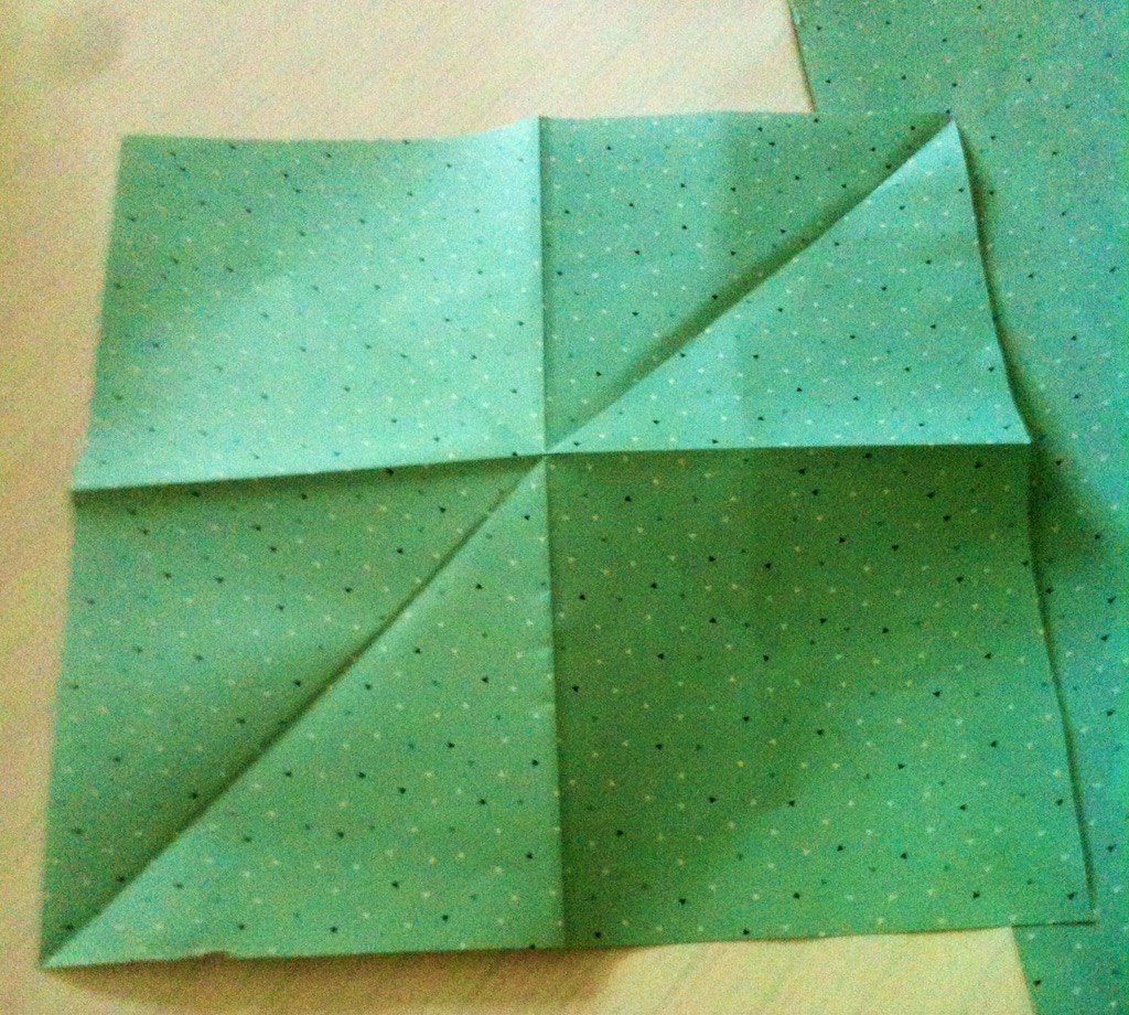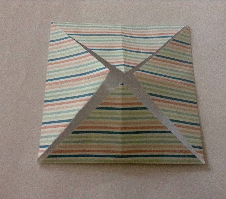Schritt zwei: nun faltet ihr alle vier Ecken von außen in die Mitte.