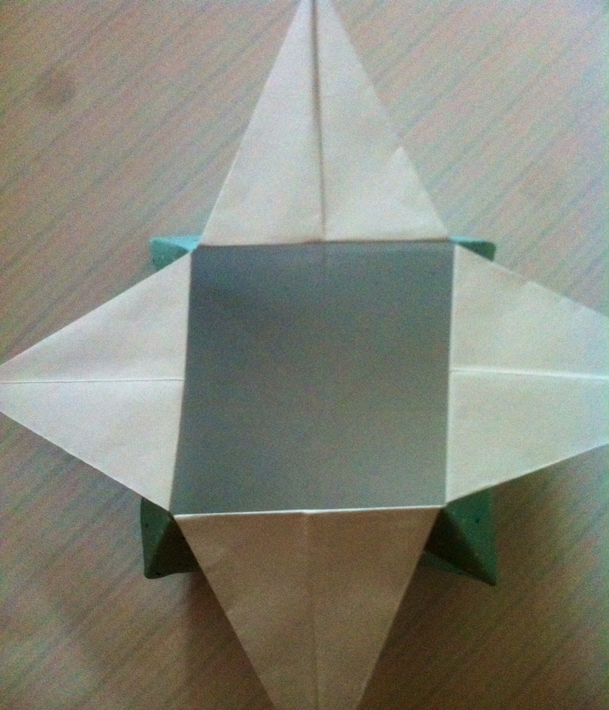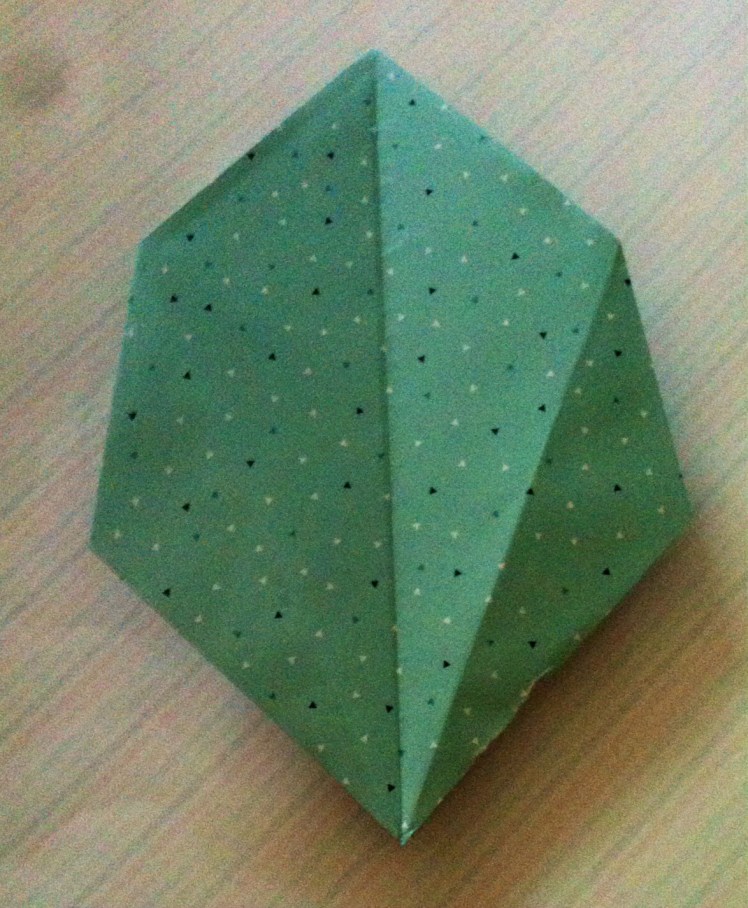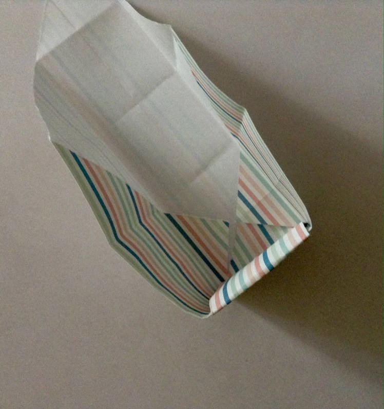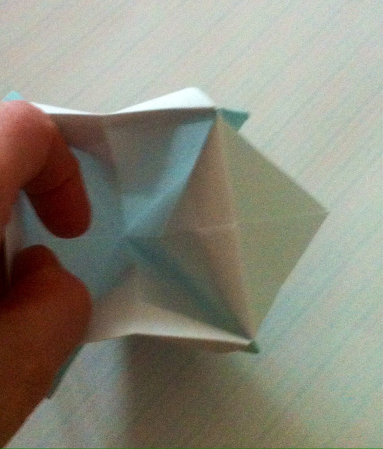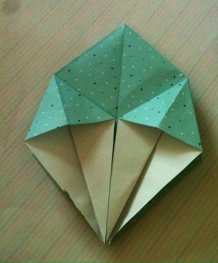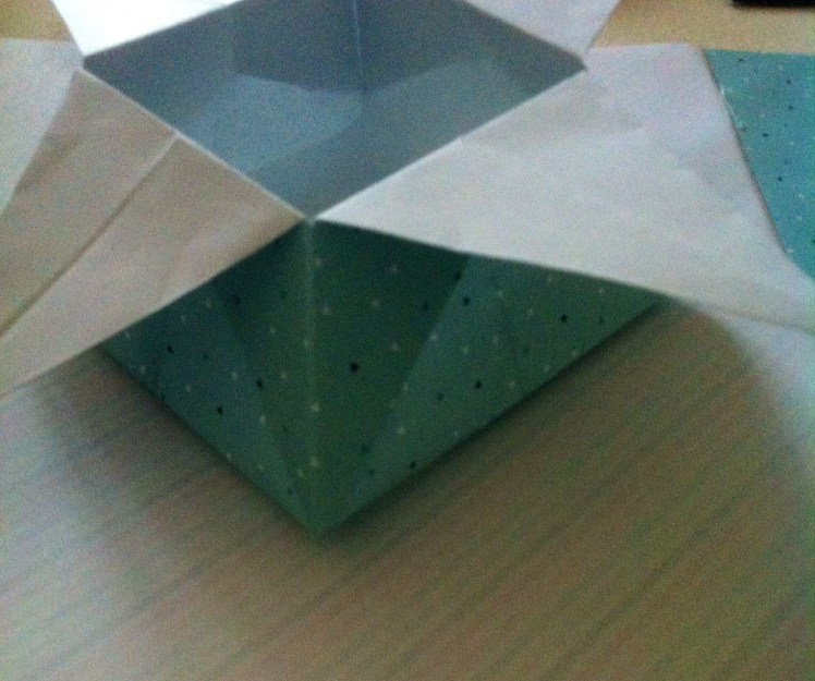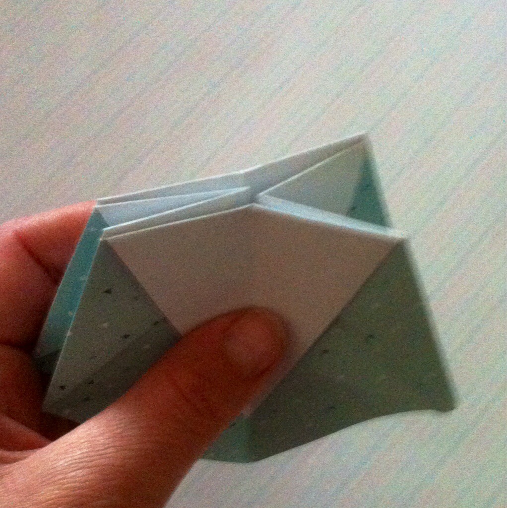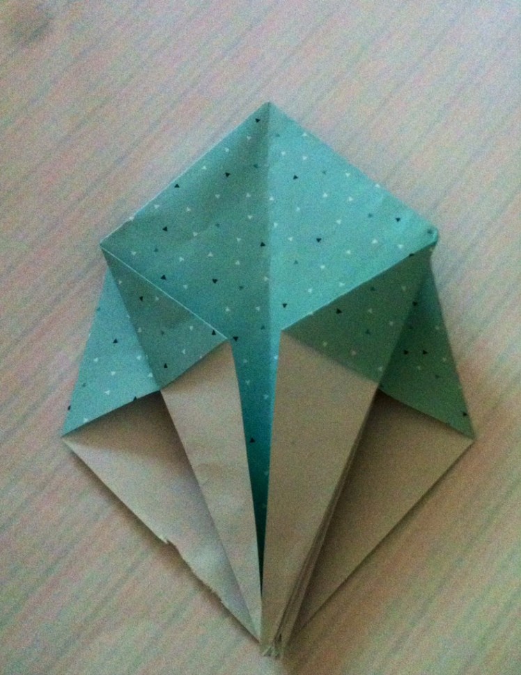 Schritt acht: Die schmalen Spitzen erneut nach unten falten und den entstandenen Innenraum ausbeulen und formen, so dass die Schachtel entsteht.