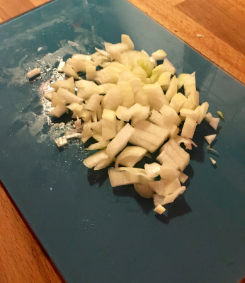 - Olivenöl in der Pfanne erhitzen und Zwiebeln goldbraun andünsten.