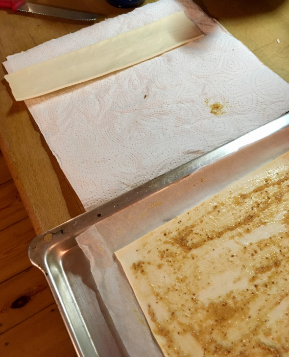 - Blätterteig ausrollen und ein rechteckiges Stück für die spärere Dekoration abtrennen und zur Seite legen.