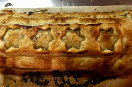 - Das rechteckige Blätterteigstück auf eine Arbeitsfläche legen und mit passenden Plätzchenausstechern ausstechen. Das Rechteck mit den Silhouetten auf den Braten legen und etwas andrücken.