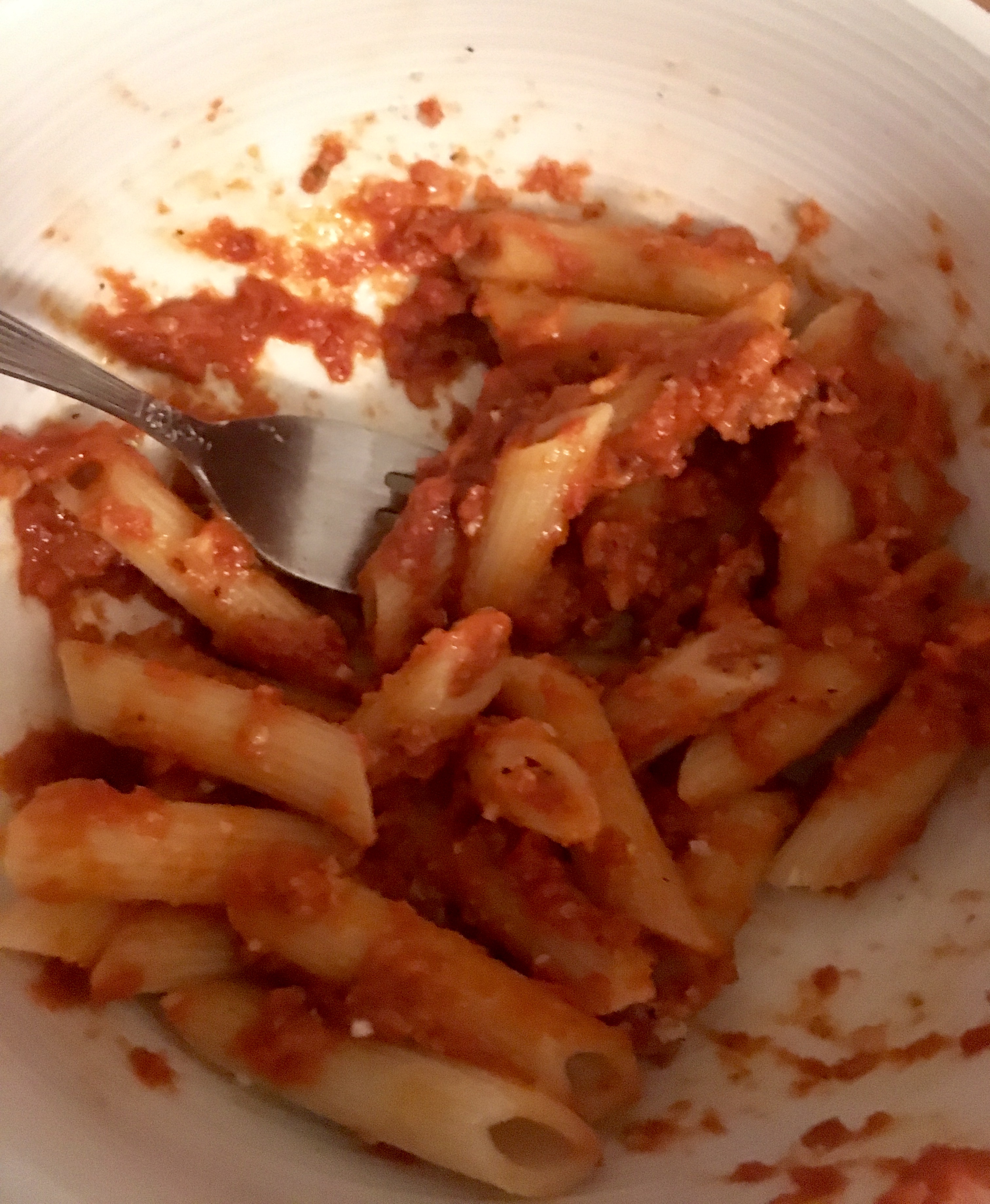 Dann koche ich seit langem Mal wieder Penne und zwar auf der neuen Herdplatte. Dazu gibt es eine rohvegane, sehr leckere Tomatensoße und Paranussparmesan.