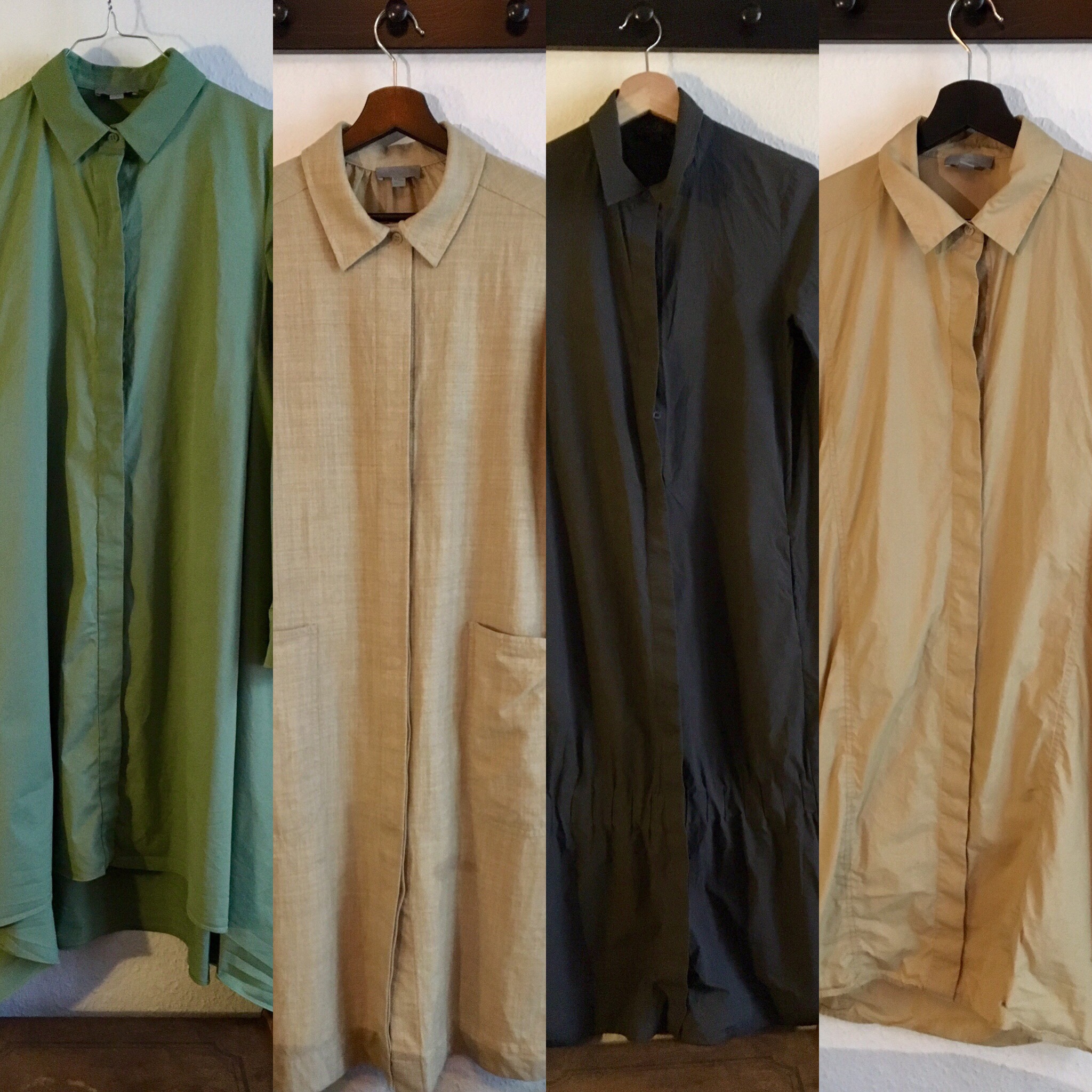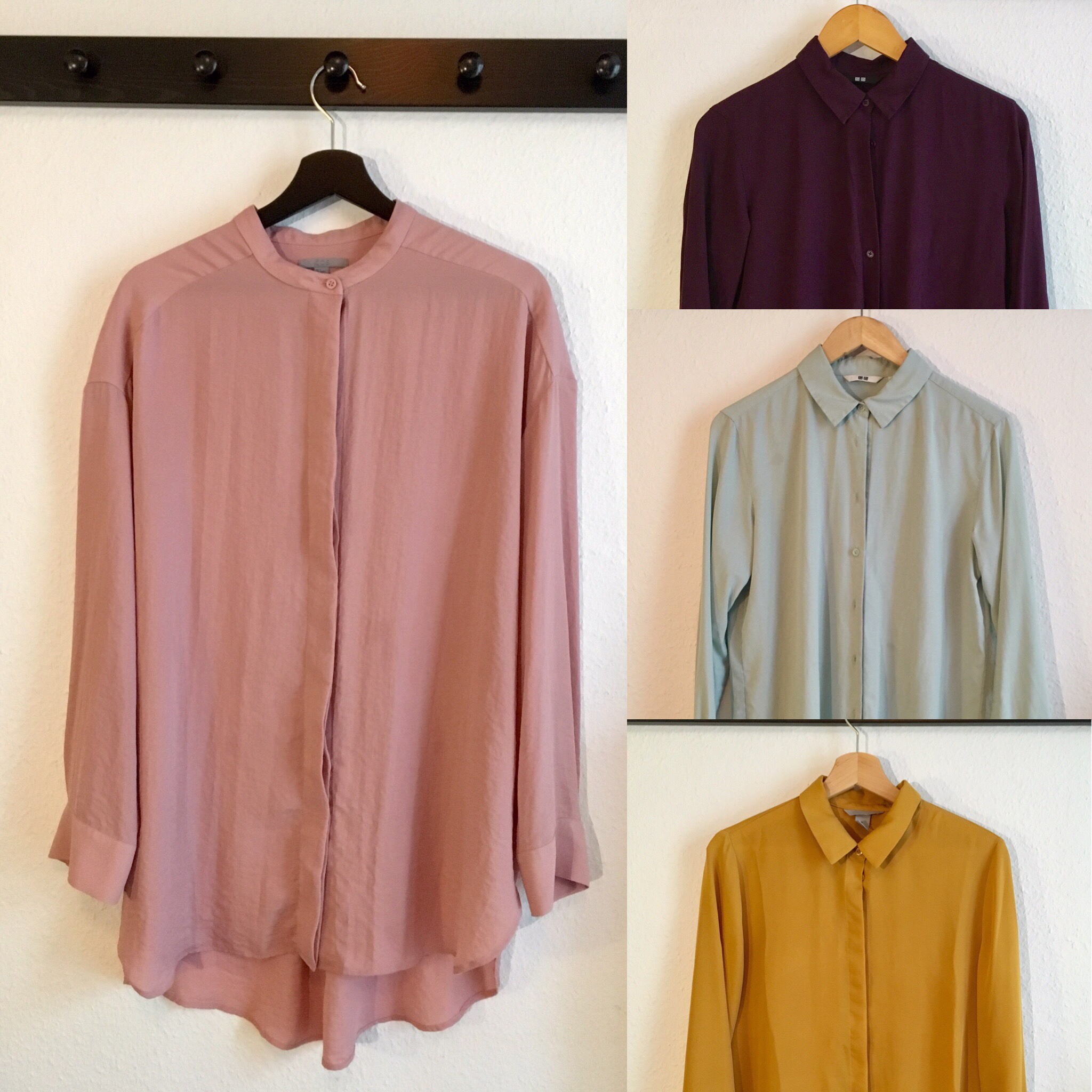 Vier Blusen – lang & rosa (COS, von 2018), lila und türkis (beide von Uniqlo und von 2018), gelb (von H&M, von 2018)