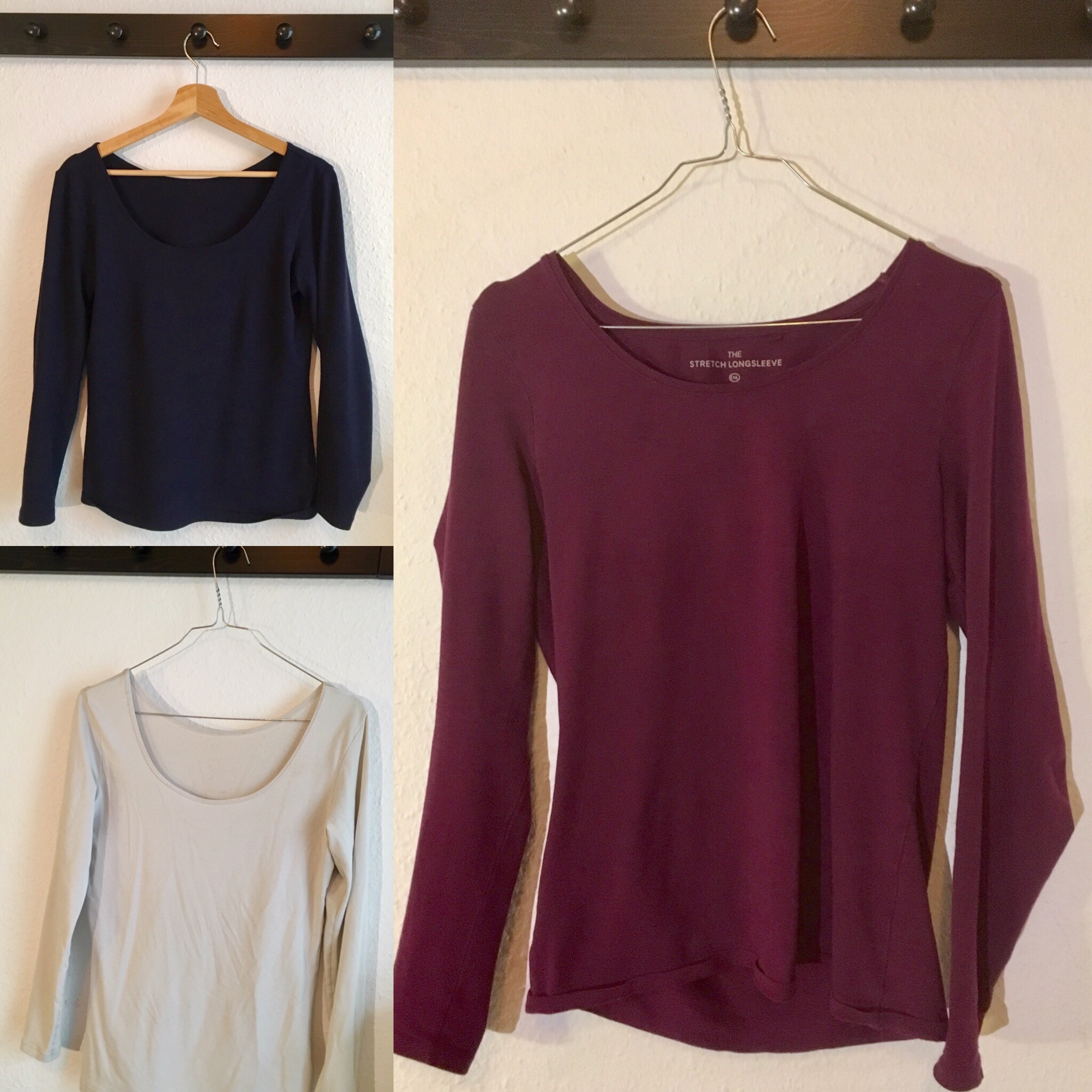 Drei langärmlige – blau und weiß (Uniqlo, von 2017), lila (Second Hand geschenkt , von 2018)