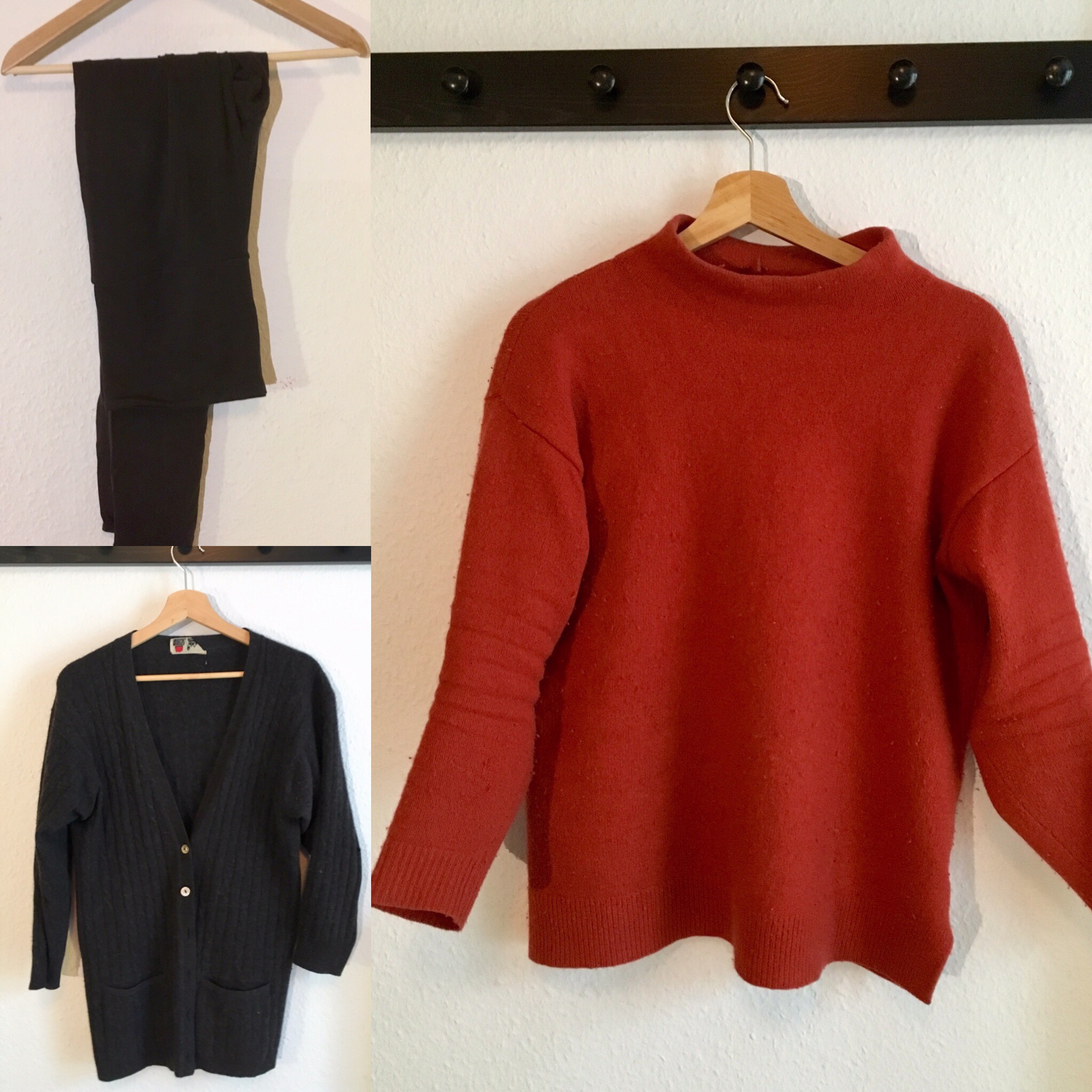 Für Zuhause – Yogaleggins (Aldi oder Lidl, vor zweidrei Jahren, Strickjacke (Second Hand geschenkt, von 2018), Pullover (Uniqlo, von 2017)