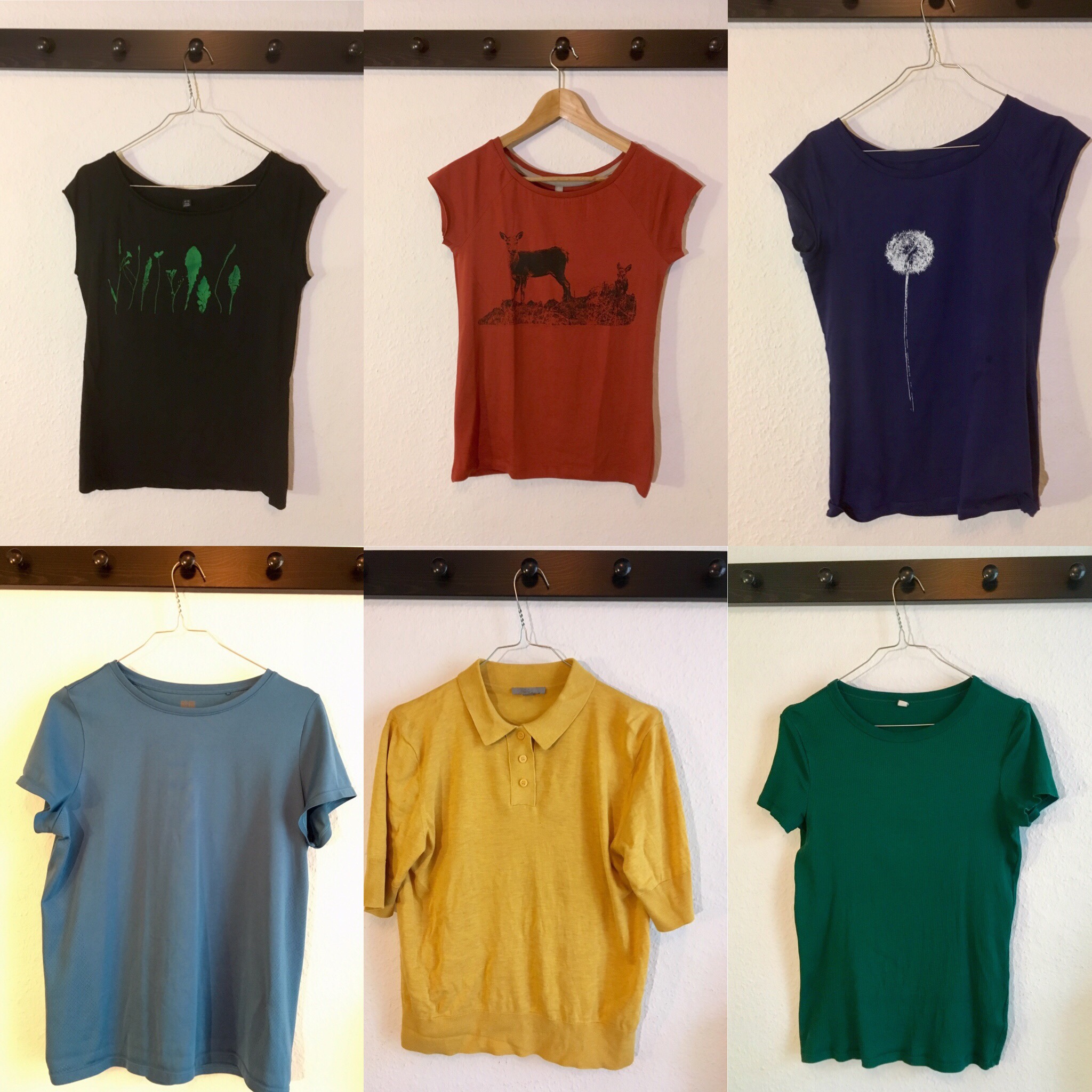 Sechs T-Shirts – Blätter, Reh und Pusteblume (alle drei aus Surpermarchè von Hirschkind, von 2018), gelb (COS, von 2018), blau und grün (Uniqlo, von 2018)