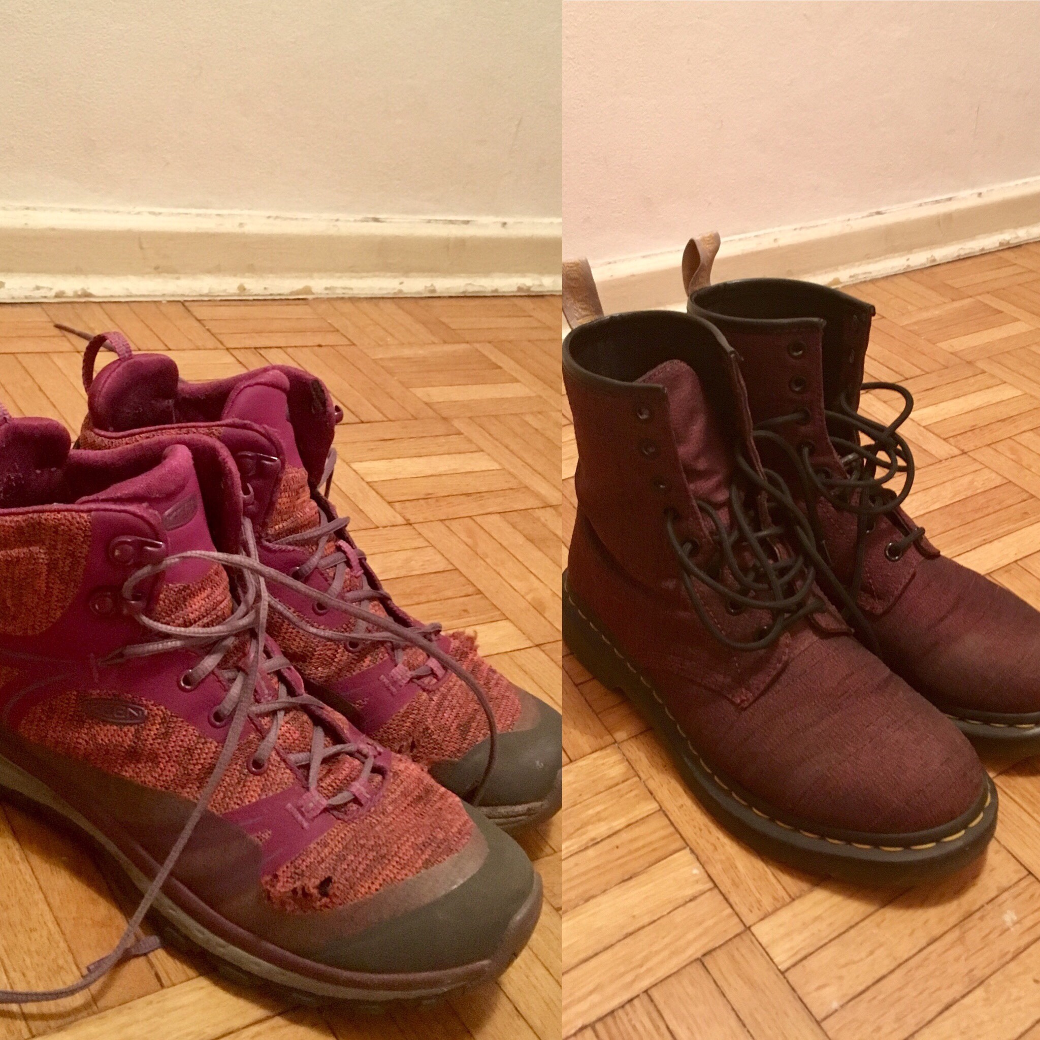 Zwei Paar Schuhe – Wanderschuhe (Globetrotter, von 2017), DocMartins (von ebenda, von 2017)