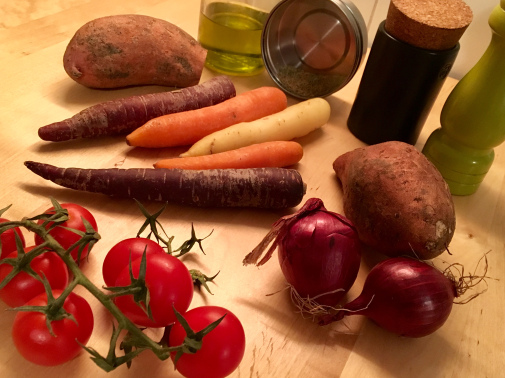 - Gemüse: ich hatte bunte Möhren und Süßkartoffel, Pastinaken passen auch gut