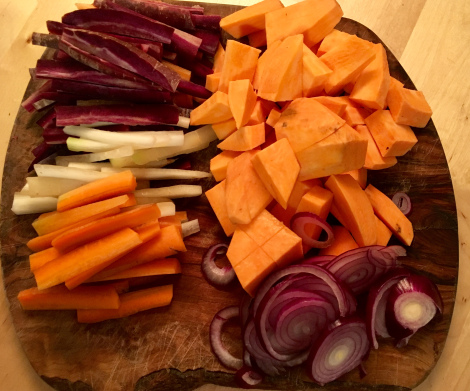 - Möhren und Süßkartoffeln in Streifen schneiden, Zwiebeln in halbe Ringe.