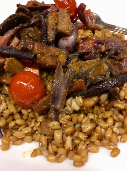 - Dinkel mit der Hälfte des Dressings vermengen, Gemüse mit Dinkel servieren und das restliche Dressing über das Gericht geben.