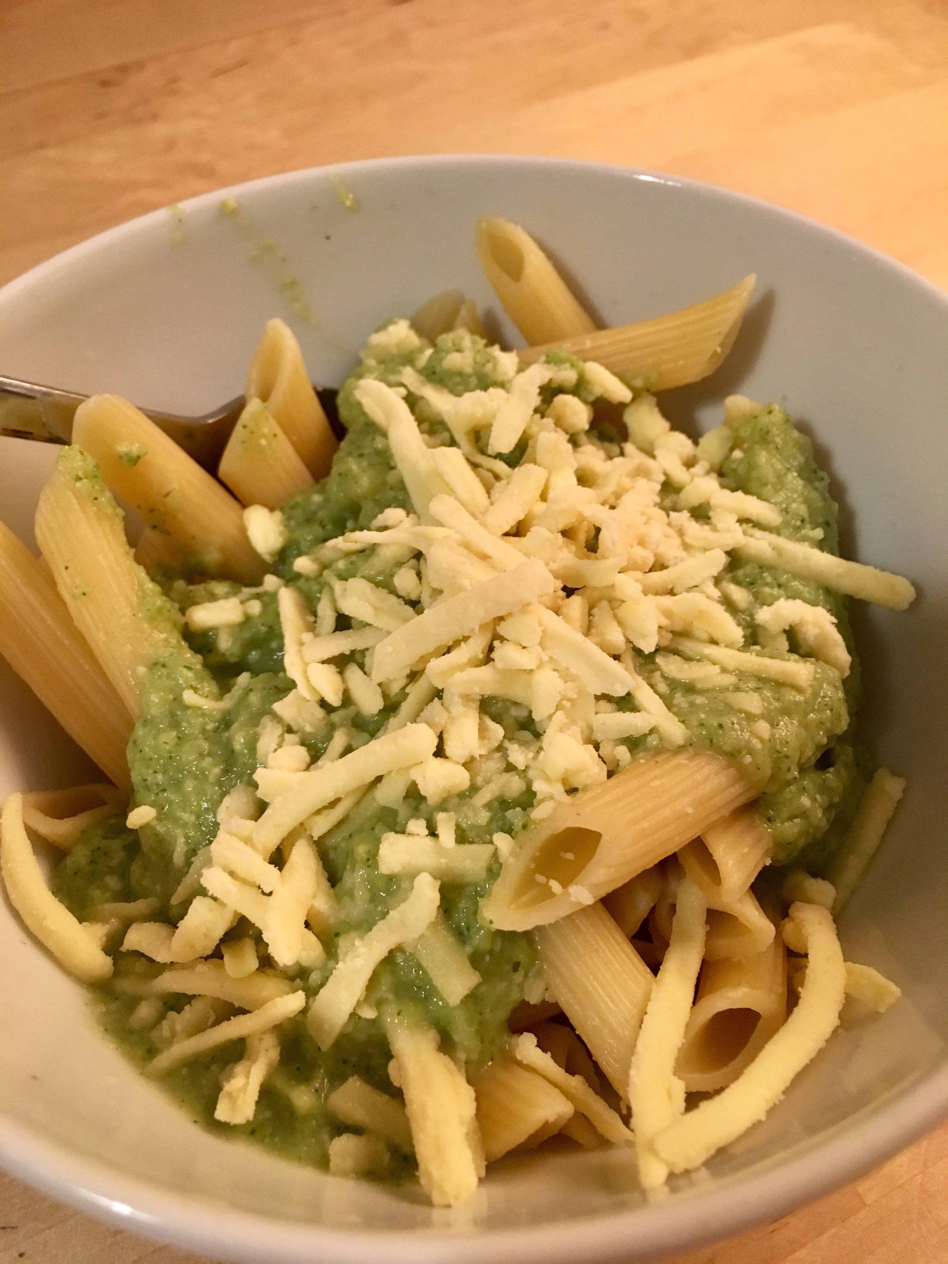 - Brokkoli in einen Mixer geben (oder mit einem Pürierstab weiterarbeiten) und die restlichen Zutaten (ausser Nudeln) hinzugeben.