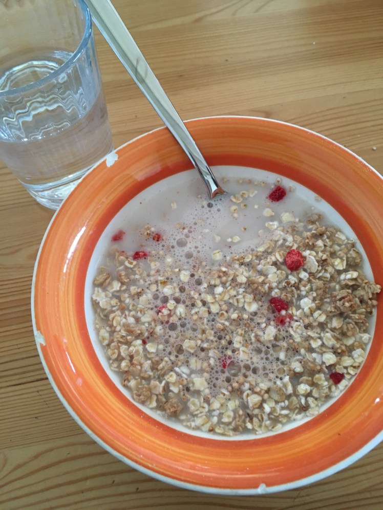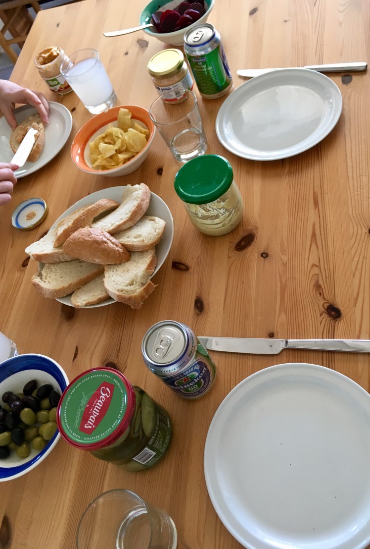 Heute war die Mitbewohnerin L. mit der Zubereitung unserer Mahlzeiten dran. Da die Preise in Dänemark nicht ohne sind, hatten wir alles mögliche in Berlin eingekauft und mitgebracht. Für uns, die wir sonst meistens mit Handgepäck in den Urlaub reisen, war das ganz schön ungewohnt auch Essen, Bettzeug und Handtücher mitzunehmen. Zum Frühstück gab es Müsli gemischt mit Haferflocken und Pflanzenmilch.