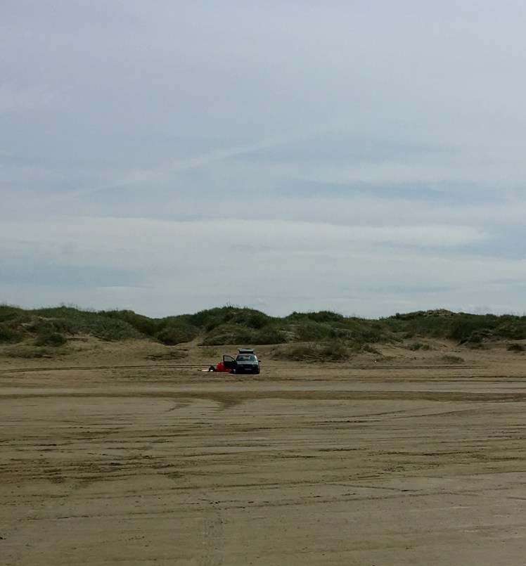 Das Wetter war herrlich: Wind und Sonne und so packten wir anschließend unsere Sachen zusammen und fuhren mit dem Auto an und auf den Strand Lakolk. Das besondere hier ist, dass man mit dem Auto auf dem Strand herumfahren darf. Dieser ist mehrere Kilometer breit und man darf mit 30km/h herumcruisen. Das macht sehr viel Spaß und läd zum wilde Kurven fahren ein.