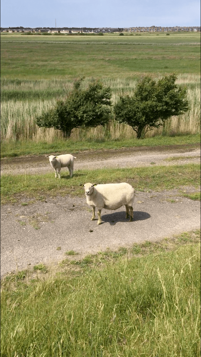 Wir liefen etwas auf dem Deich herum, machten mit einigen Schafen Bekanntschaft und kauften dann noch Mehl, Brot und was zum Trinken ein. Dann fuhren wir an den Strand, der hier liegt. Es war gerade Ebbe und irgendwie konnten wir nicht wirklich durchschauen, wo eigentlich Land ist und wo eigentlich Meer sein sollte. Das machte das Herumfahren sehr aufregend.