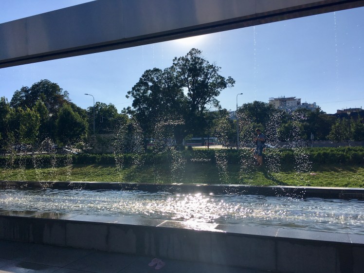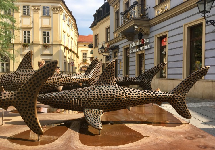 Weiter ging es wieder in die Altstadt von Brno. Nachdem wir durch einen kleinen Park gegangen waren und an vielen Gründerzeitenbauten vorbei, kamen wir zum Platz vor dem Janáčkovo Theater und dem dortigen besonderen Brunnen, bei dem das Wasser in besonderen Formen vom oben nach unten fällt.