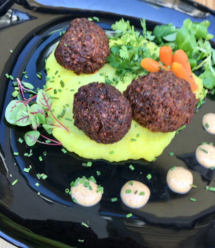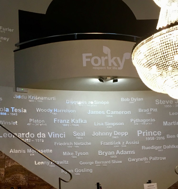 An einer Wand des Restaurants werden berühmte Menschen aufgezählt, die sich pflanzenbasiert ernährten.