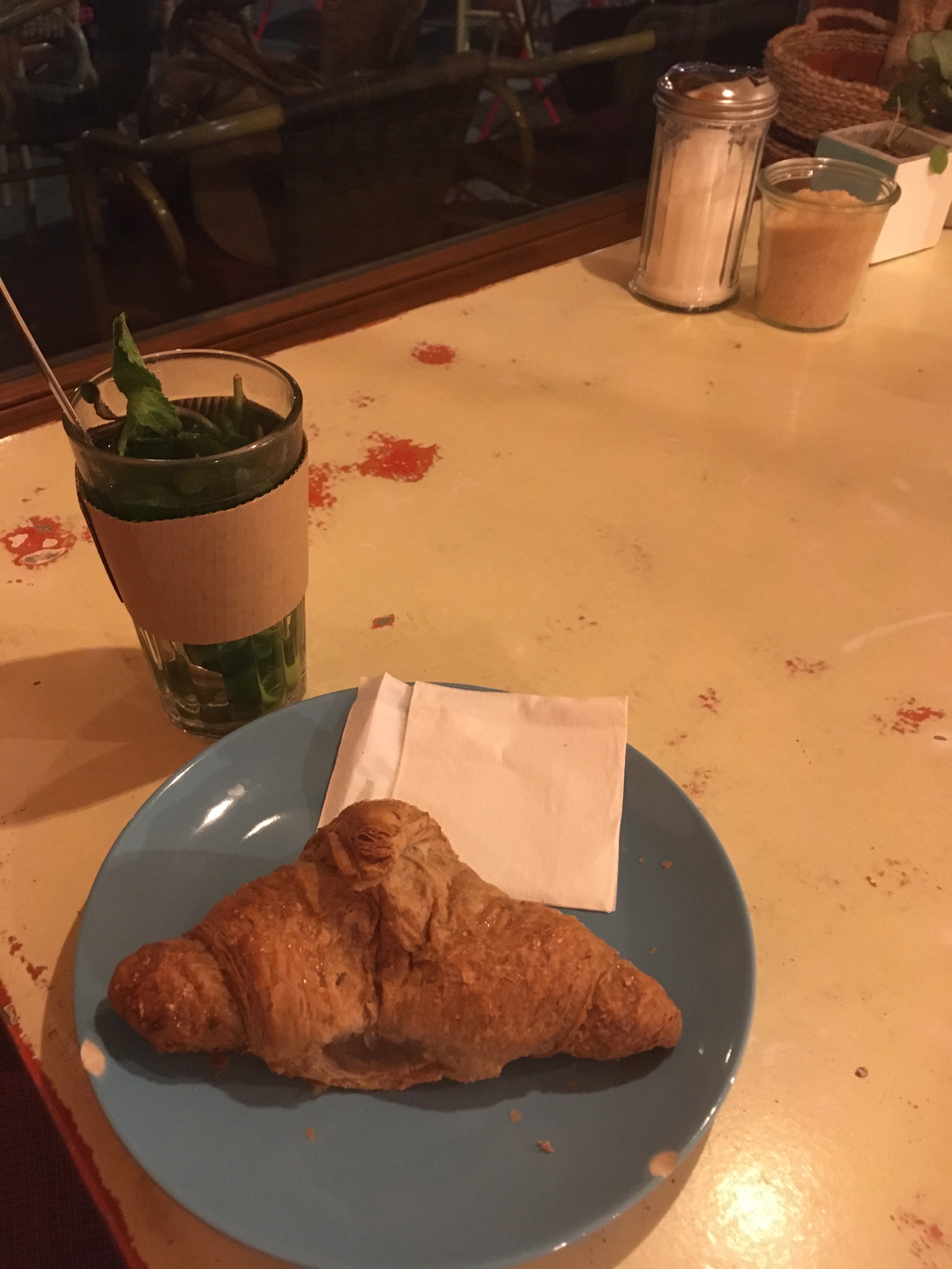 Mitte Oktober traf ich mich abends mit einer Freundin und wir zogen die Akazienstrasse entlang auf der Suche nach einem netten Café. Irgendwie redeten wir dann aber und redeten und landeten letztendlich am Nollendorfplatz und tranken dort einen Tee und aßen Kuchen bzw. Croissant. Immer wenn ich irgendwo ein veganes Croissant entdecke, muss ich zuschlagen – dieses war mit Apfel gefüllt.