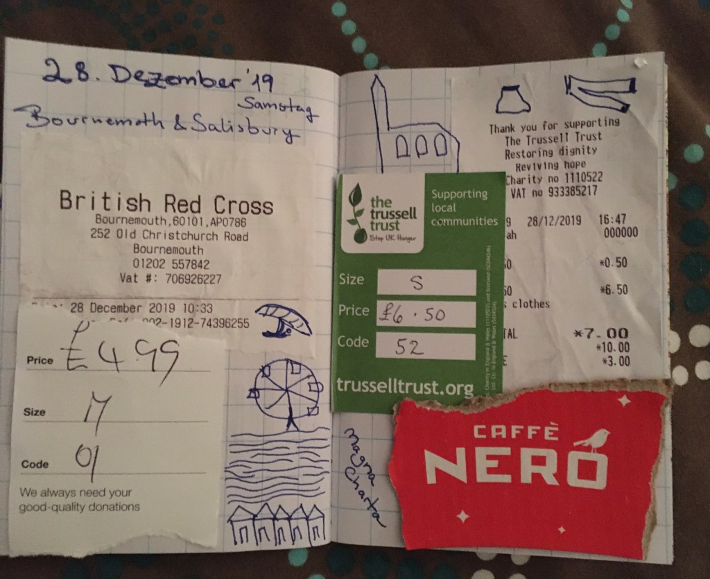 Für uns waren neben der Kathedrale die vielen, vielen Charity Shops die Hauptattraktion. Sie liegen wie an einer Perlenkette aneinander gereiht und haben, wie ich finde, eine viel bessere Auswahl zu viel günstigeren Preisen als in Deutschland bzw. Berlin.