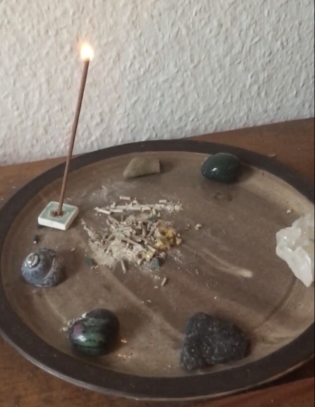 Etwas, das ich früher sehr häufig gemacht und die letzten Jahre dann gar nicht mehr und jetzt grad wieder für mich entdecke, ist das Räuchern. Etwa zwei Mal täglich brennt nun so ein kleines Stäbchen herunter. Den Teller bekam ich von einer der Karlshorstkolleginnen zum Geburtstag und die Steine sind eine kleine Sammlung – die neuesten stammen vom Waldfreund, der ihn in Dänemark gefunden hatte und von der Großen, in Bournemouth gefunden, als ich grad bei ihr war.