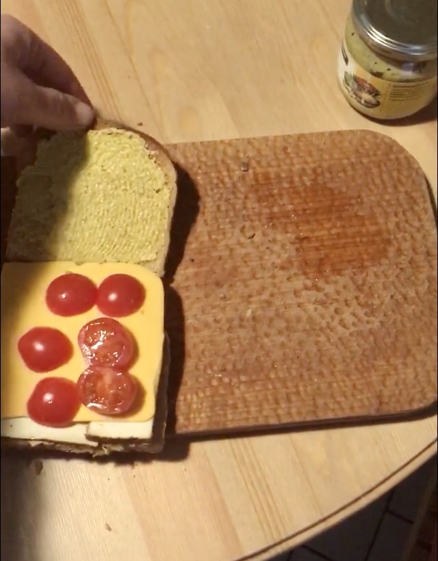 Kurz nach halb zwei ist es Zeit für eine kleine Zwischenmahlzeit. also eigentlich ist der Hunger schon groß, aber ich habe keine Lust zu kochen grad. Daher mache ich mir ein Brot und lass es mir schmecken.