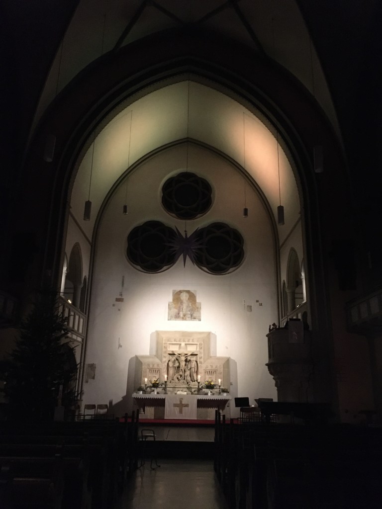 In der S Bahn treffe ich mich mit der Tanzfreundin und quatschender Weise fahren wir zusammen weiter nach Friedrichshagen. Hier haben wir noch etwas Zeit und laufen die Bölschestrasse entlang, bis wir schließlich halb acht die Kirche betreten, wo heute Balfolk getanzt wird.