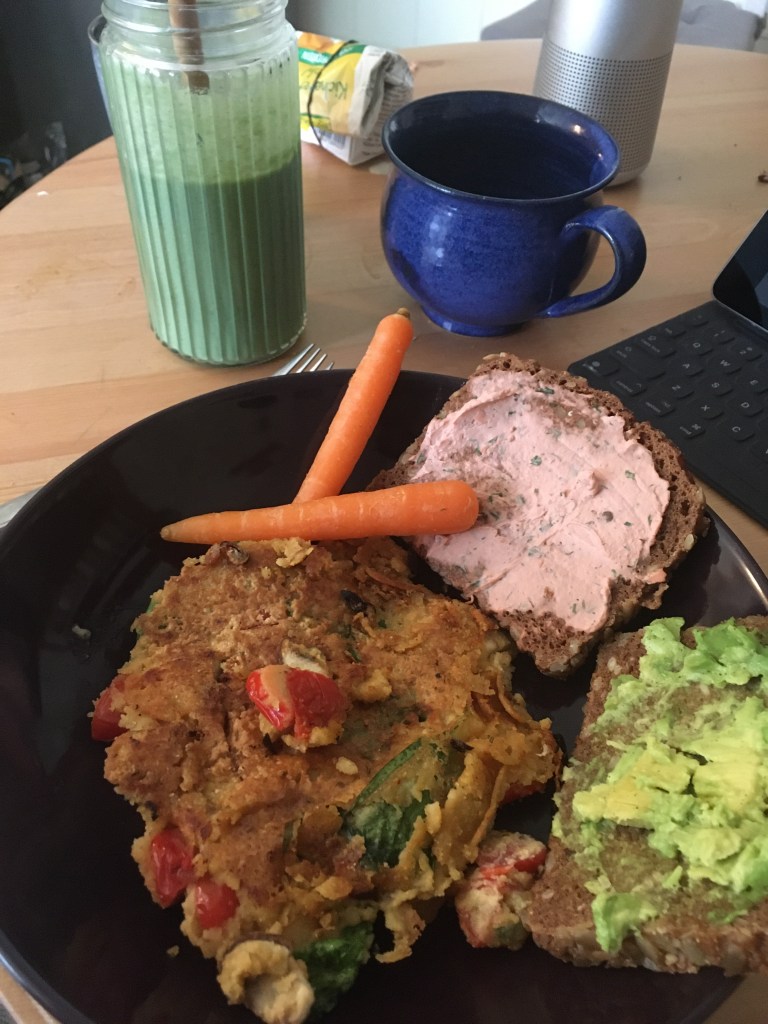 Dann wird Frühstück gemacht: für mich nen Smoothie und für die Mitbewohnerin und mich ein paar Brote und Omelett aus Kirchererbsenmehl und Kala Namak.