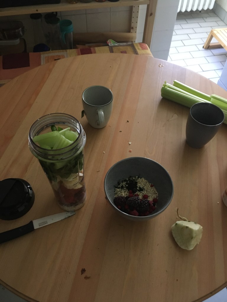 Weiter geht es mit Yoga und einem Smoothie zum Frühstück. Die Mitbewohnerin bekommt Porridge.