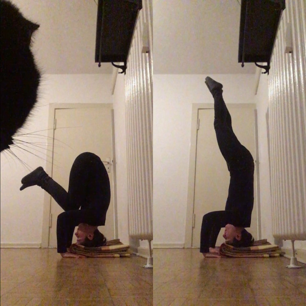 Am zweiten arbeite ich noch und bin jetzt an einem Punkt beim Handstand üben, an dem ich eigentlich einen zweiten Menschen bräuchte. Aber es wird, es wird…