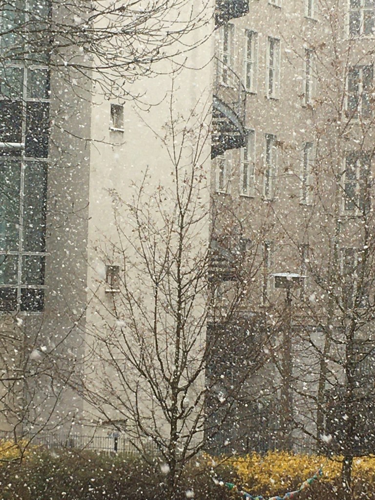 Und dann, am letzten Tag des Monats kam endlich Schnee! Abgesehen vom Schnee, den ich bei meiner Reise aus dem Bus heraus sah, der erste Schnee für mich in diesem Winter (obwohl ja schon Frühling war). Wie ein Kind stand ich bezaubert in dieser weißen Pracht.