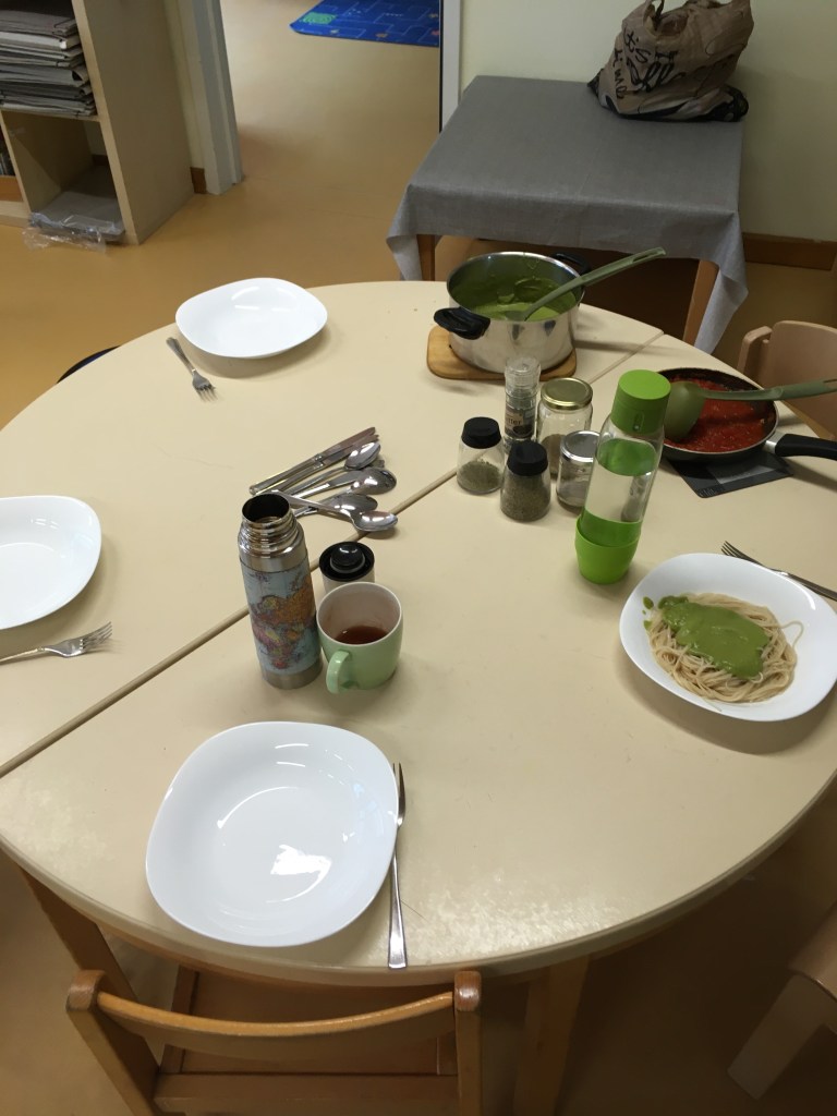 Und dann begannen die merkwürdigen Tage in der leeren Kita. Ich putzte alle Räume, alles Spielzeug und wir wenigen Kollegen, die wir noch arbeiten durften/mussten saßen zum Essen beisammen.