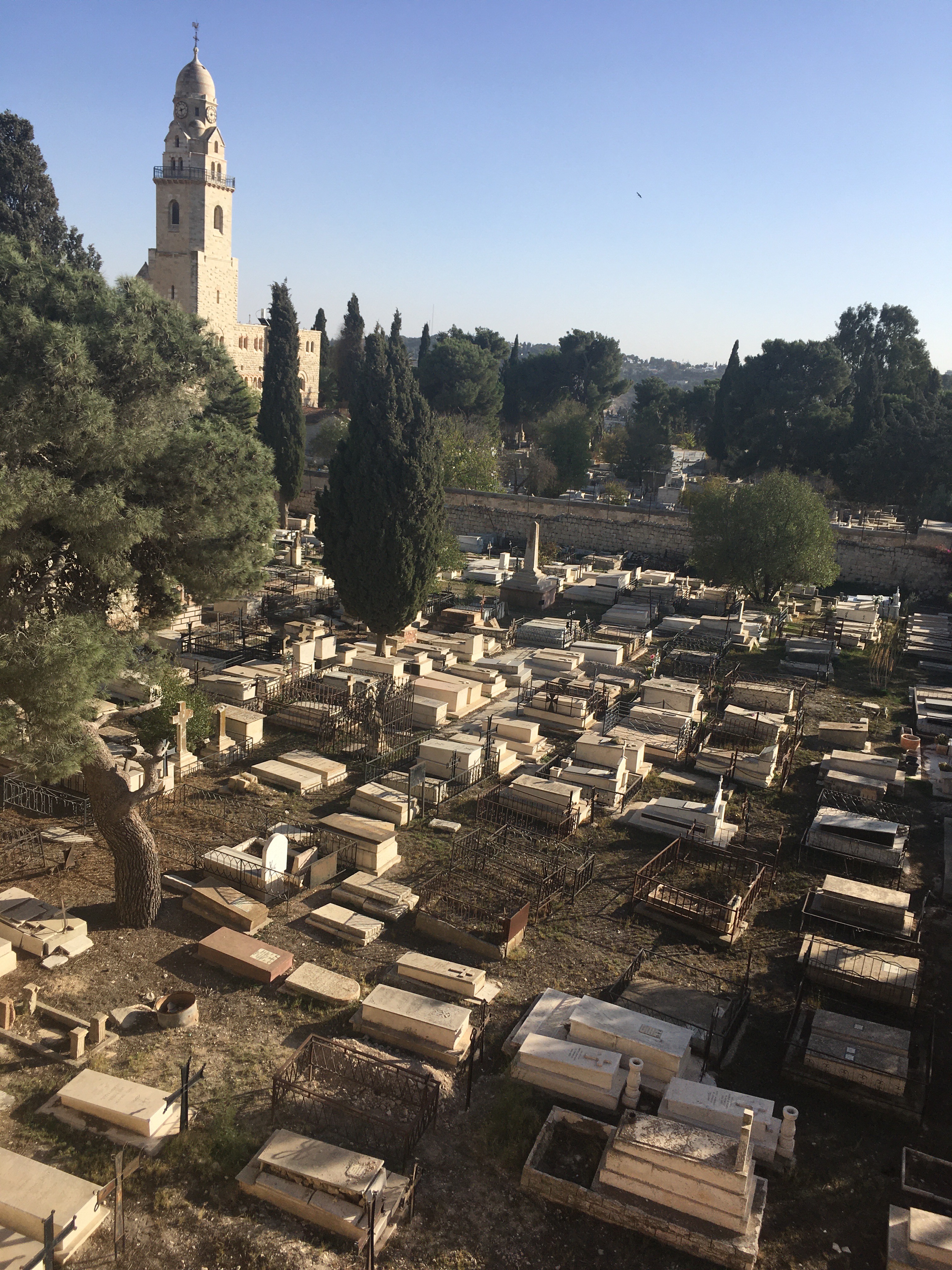 Schließlich ging ich bergab und kam am jüdischen Friedhof vorbei und ging kurz auf das Gelände der Dominus flevit, einer kleinen römisch-katholischen Kirche, auf der auch prompt im Freien eine Art Gottesdienst stattfand. Da inzwischen der Muezzin wieder angefangen hatte zu rufen und der jüdische Friedhof immer noch zu alle Seiten hin lag, war das wieder einmal einer diesen abgefahrenen Momente in Jerusalem, wo alles aufeinander trifft.