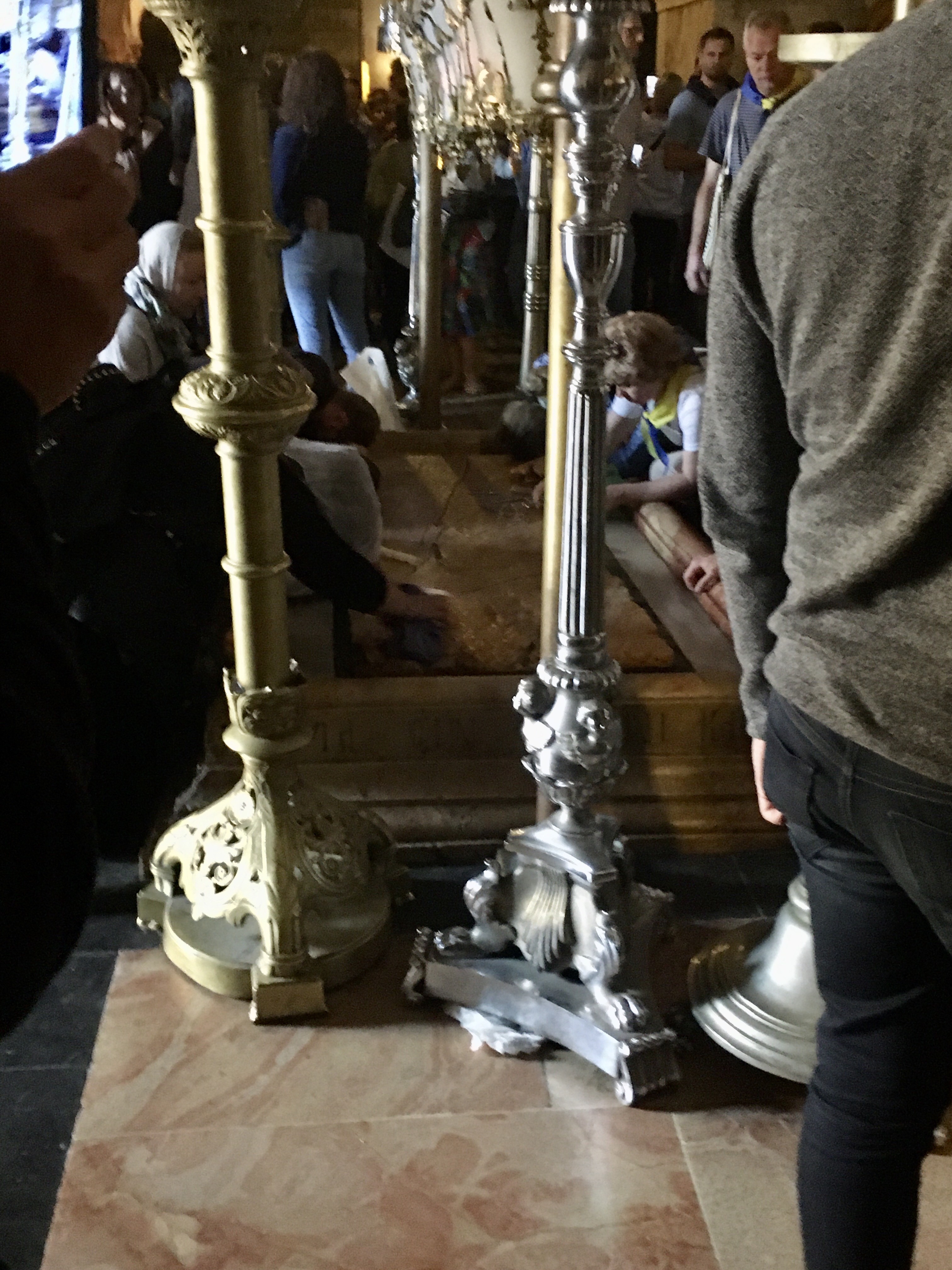 23. Kreuzigungsaltar und Stabat-Mater-Altar – griechisch orthodox: damit sind wir auf Golgatha. Um hierher zu kommen geht man eine von zwei sehr steilen Treppen empor. Einmal verlor eine Frau beim Heruntersteigen ihren Halt und rutschte dann auf ihrem Hintern hinab, was sehr schmerzhaft aussah. Hier oben gibt es zwei Altare, dieser ist einer davon. Hier soll Christus gekreuzigt worden sein. Unter dem Altar befindet sich eine Vertiefung, in der sein Kreuz gestanden haben soll. Die Menschen stehen an, um sich davor zu knien und den Ort zu küssen. Bei meinem zweiten Besuch war hier ein sehr resoluter Mönch, der vor sich hin schimpfend die Leute hierhin und dorthin geschickt hat und sie ausgeschimpft hat, als sie anfingen laut zu singen, damit er die Absperrung aufmacht. Die ganze Empore ist einer meiner vier Lieblingsorte. Die Stimmung ist hier irgendwie dichter, nicht nur wegen der vielen Menschen und zudem kann man wunderbar von hier auf verschiedene Teile der Kirche herunterschauen. Und es ist wirklich immer irgendwas los.