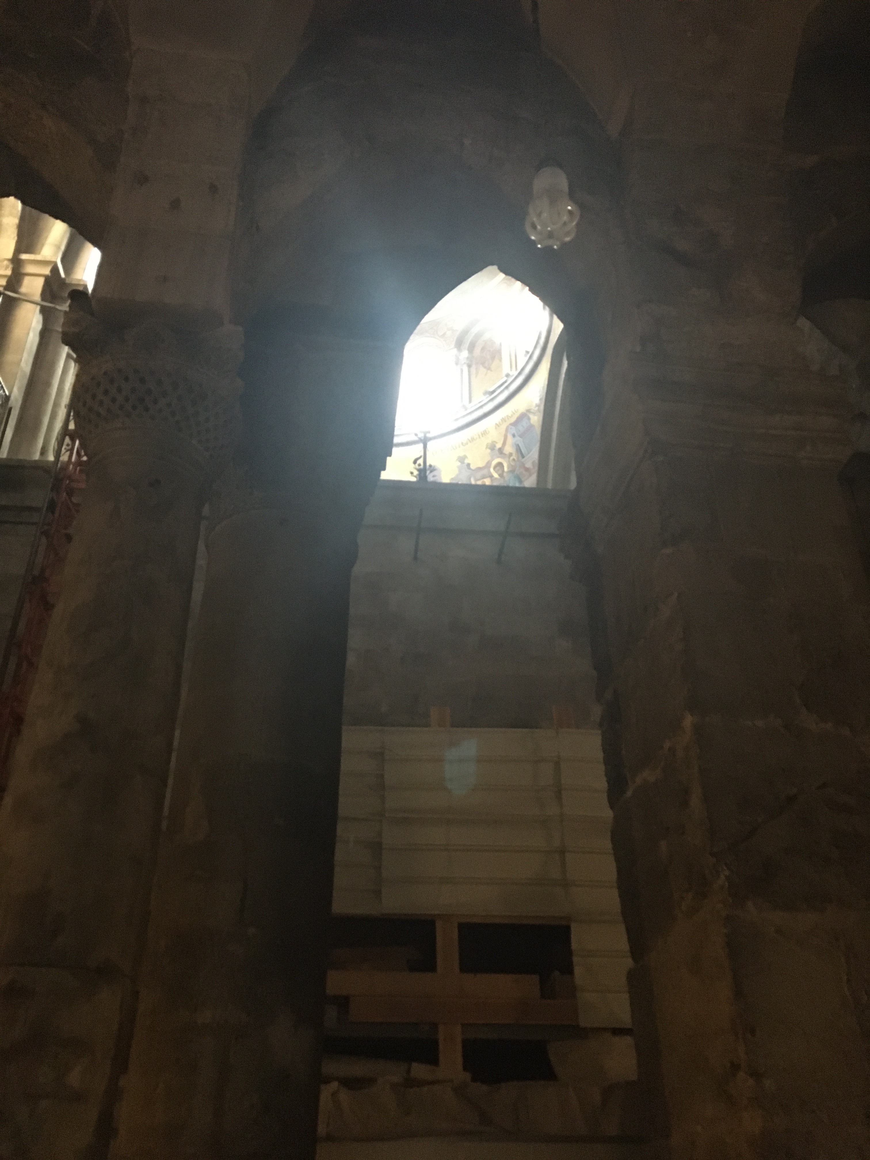 Also machte ich mich ans Werk und flitzte kreuz und quer durch die Kirche. Manchmal saß ich ziemlich lange auf den ein oder anderen Mauervorsprung, um die Gelegenheit für ein Foto ohne Menschenmassen zu bekommen. Besonders beeindruckend war es für mich, als die griechisch-orthodoxen und die Franziskaner zur gleichen Zeit ihre Gottesdienste abhielten, aber jeder in ihrem Teil der Kirche. Die Franziskaner kamen dann heraus und pilgerten zum Grab Jesu und wieder zurück. Danach liefen zwei Mönche mit Weihrauch mehrmals die ganze Kirche ab, was viele Menschen zum Husten brachte.