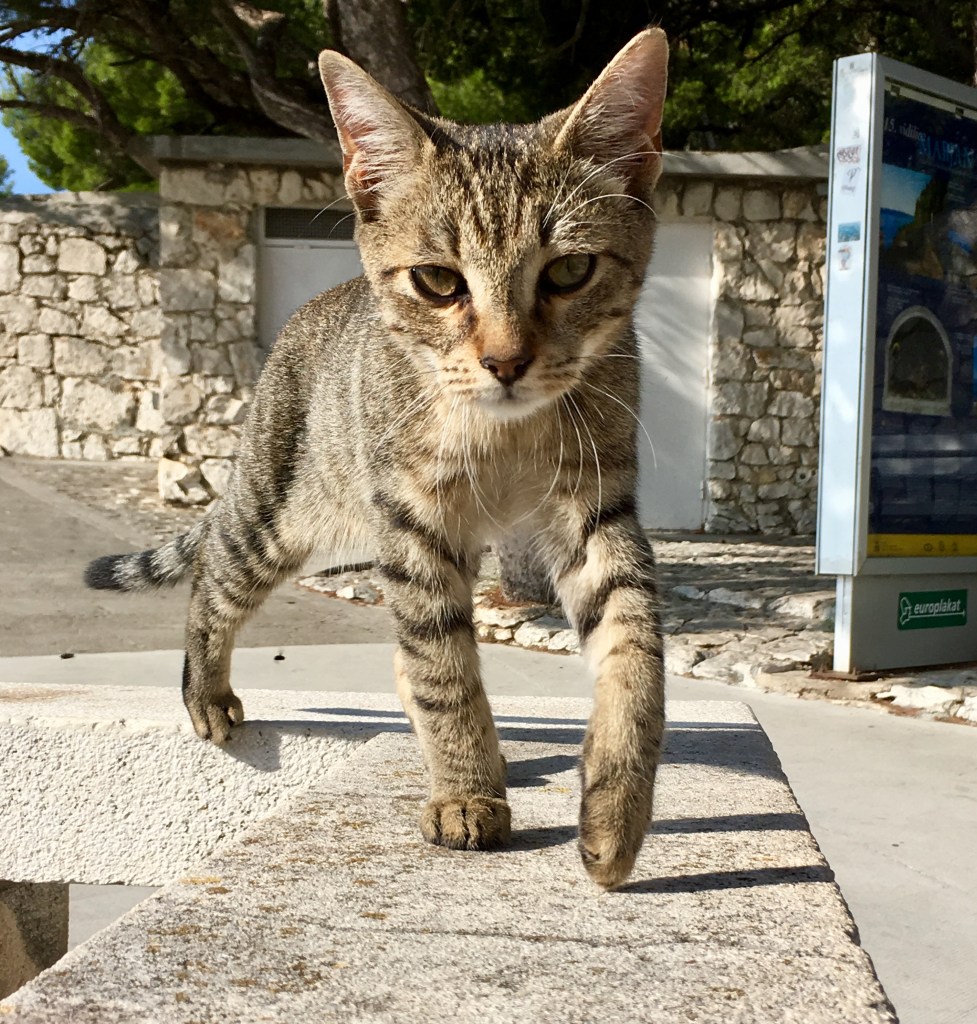 Und ich hatte mich nicht getäuscht – auch sie waren sofort begeistert von der sehr eigenen Atmosphäre des Ortes. Wir starteten wie so oft vom Busbahnhof aus, bemerkten aber schnell, dass der Weg umsonst war, da der Bus genau vor unserem Haus hielt 🙂 . Wir fuhren in südliche Richtung und das Stadtbild ist hier ein ganz anderes.Nach einer knappen Stunde Fahrt kamen wir in Omiš, dem alten Piratennest an. Eigentlich brauche ich gar nicht viel schreiben, denn die Bilder sprechen für sich. Das hier habe ich vor zwei Jahren dazu geschrieben: Omiš war nie in den Händen der Türken und hat auch lange, lange den Venezianern nicht nur widerstanden, sondern ihnen mit der Piraterei das Leben schwer gemacht. Erst 1444 kamen dann die Venezianer an die Macht und so hat auch das Aussehen dieser Stadt diese schöne venezianisch-kroatische Mischung. In der Neuzeit hat Omiš auch einiges zu bieten. Es gibt gleich zwei Festungen. Mirabella direkt oberhalb der Stadt und Starigrad weit oben auf einem Felsen zu erahnen. Mirabella haben wir besucht und diese Festung hat das Potenzial zu einem meiner Lieblingsorte auf der Erde zu werden.Ich finde die Berge einfach so beeindruckend und kann mich nicht sattsehen an ihnen.Aber auch die Stadt an sich hat etwa sehr charmantes, finde ich.Und dann, als wäre das noch nicht genug, das Meer!Wir liefen, nachdem wir die Burg bestiegen haben und meine Mutter dabei sehr viel Mut und Beweglichkeit bewiesen hatte, einmal am Fluss entlang und begegneten einigen Katzen, die dort auf Fischabfall hofften.Auf dem Platz vor der Kirche setzten wir uns dann zum Essen, auch hier hatten wir Gäste.Schließlich fuhren wir sehr glücklich und voller schöner Eindrücke wieder zurück nach Split.